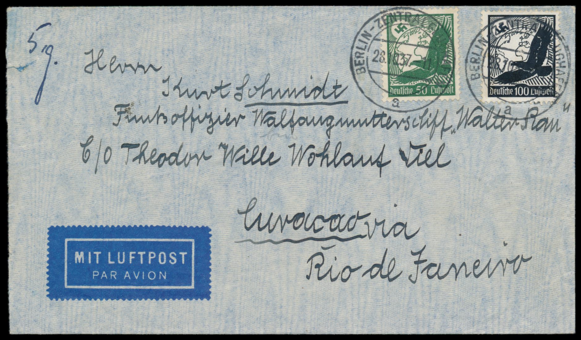 Dt. Reich 50 Pf. und 100 Pf. Flugpost auf Luftpostbrief mit Stempel Berlin-Zentralflughafen 28.10.37 an einen Funkoffizier an Bord Walfangmutterschiff "Walter Rau" in Rio de Janeiro, undeutlicher Ankunftstempel, Bedarf