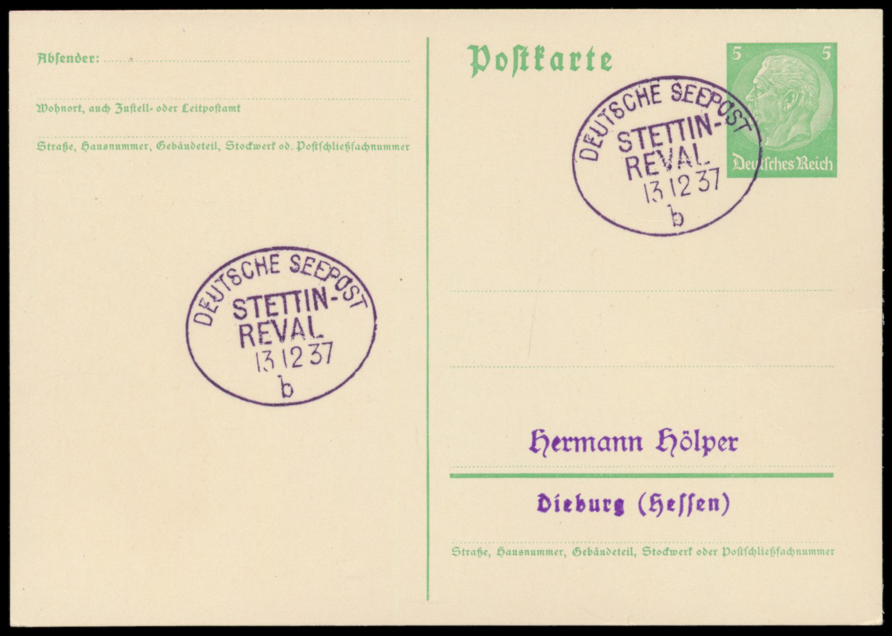 2 x seltener violetter Ovalstempel Deutsche Seepost Stettin - Reval b 13.12.37 auf Ganzsache 5 Pf. nach Dieburg, Stempel-Beschaffungskarte mit gestempelter Adresse und ohne Text