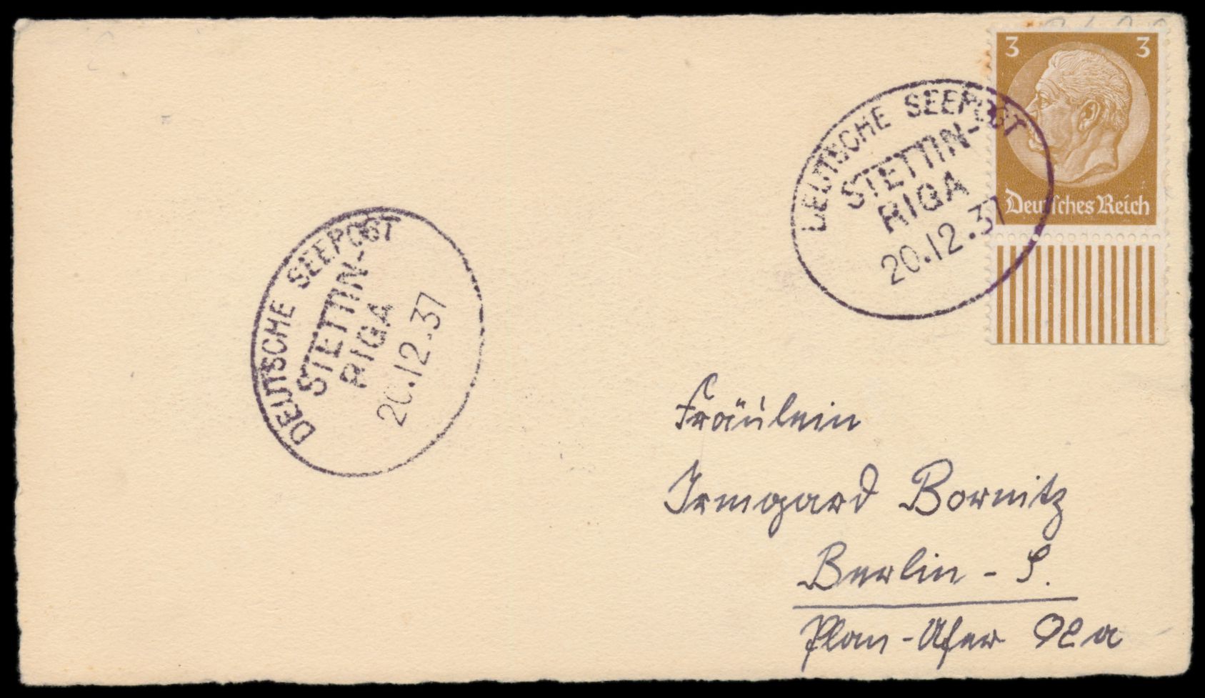 2 x seltener Ovalstempel Deutsche Seepost Stettin - Riga 20.12.37 auf Drucksachenkarte mit 3 Pf. Hindenburg nach Berlin, Stempel-Beschaffungskarte