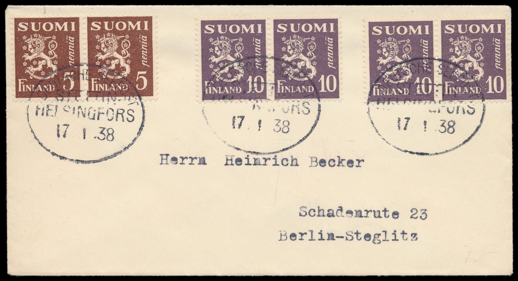 Ovalstempel Deutsche Seepost Stettin - Helsingfors 17.1.38, 3 Abschläge auf Brief mit Finnland 2 x 5 P. und 4 x 10 P. nach Berlin