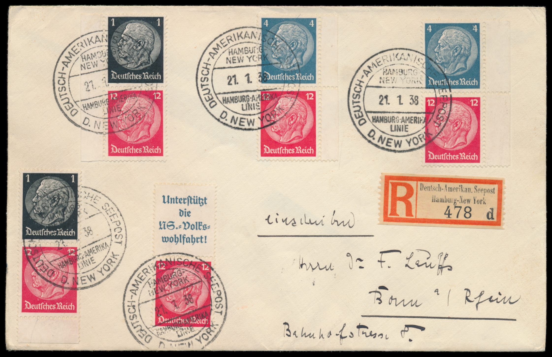 Stempel Deutsch-Amerikanische Seepost Hamburg - New York ... D. New York 21.1.38 auf Einschreibbrief mit Zusammendruck-Frankatur 70 Pf. für die 2. Gewichtsstufe nach Bonn, Ankunftstempel 23.1.38, portorichtig