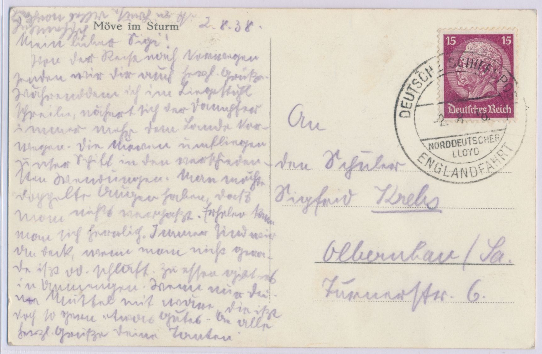 Stempel Deutsche Schiffspost / Norddeutscher Lloyd / Englandfahrt 2.8.38 auf Ansichtskarte mit 15 Pf. Hindenburg nach Olbernhau, Bedarf