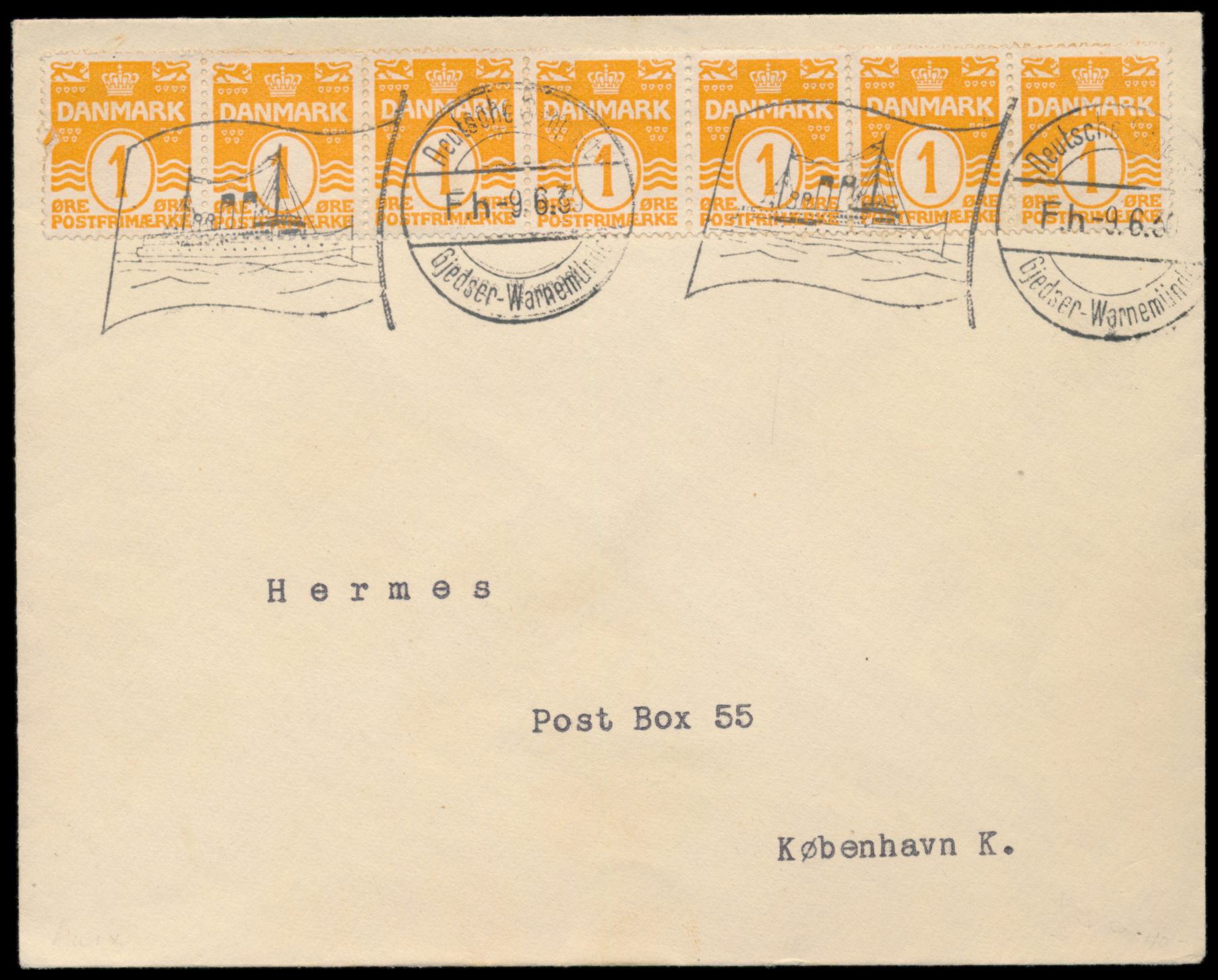 Flaggenstempel Deutsche Seepost Gjedser - Warnemünde Fh 9.6.39 auf Drucksachen-Umschlag mit Dänemark-Frankatur 7 x 1 Öre nach Kopenhagen