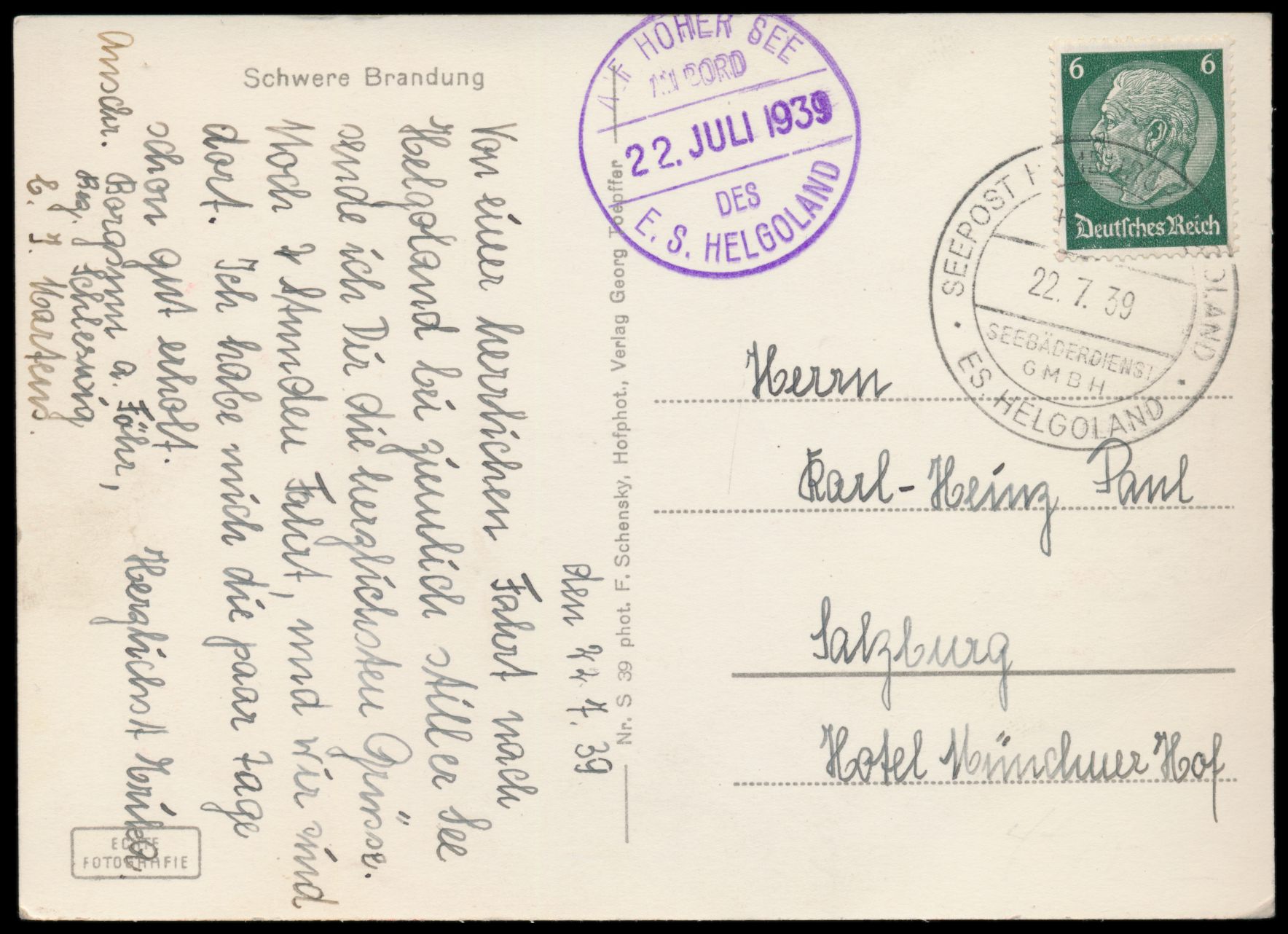 seltener Stempel Seepost Hamburg - Helgoland Seebäderdienst G.M.B.H. ES Helgoland 22.7.39, nur vom 18.7. bis 21.8.1939 in Verwendung, zusammen mit violettem Bordstempel "Auf Hoher See ..." auf Ansichtskarte nach Salzburg, Handbuch LP, Bedarf