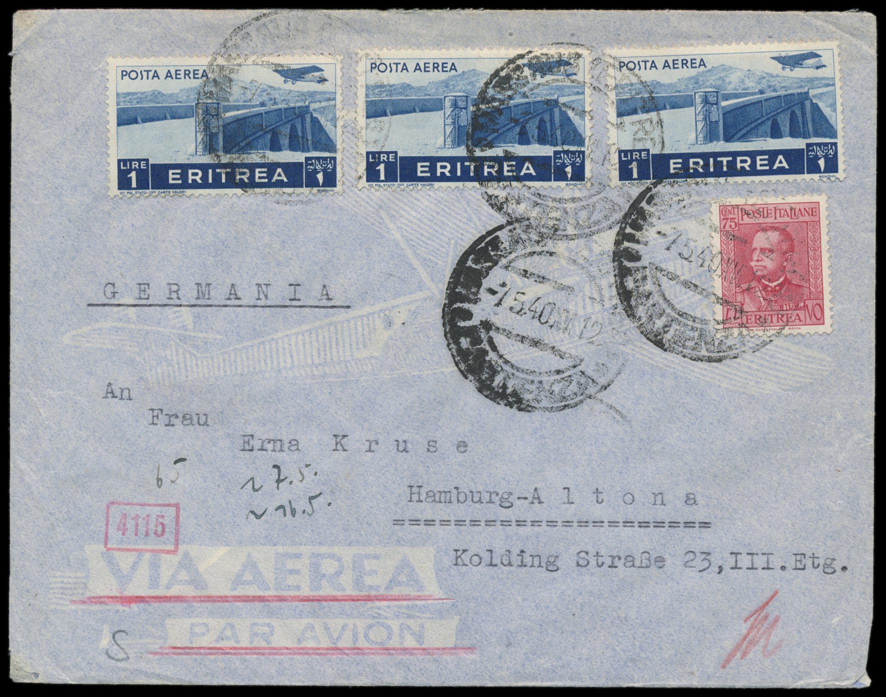 Eritrea 55 C. und 3 x 1 L. auf Luftpostbrief mit Stempel Massaua 7.5.40 nach Hamburg, handschriftlicher Absender "... II. Ing. Dpf. Bertram Rickmers ...", rückseitig OKW-Zensur München. Nach Kriegseintritt Italiens und Eroberung Eritreas durch britische Truppen versuchte der Dampfer Ende März 1941 aus Massaua zu entkommen, wurde vom britischen Kriegsschiff Kandahar am 1.4.1941 im Roten Meer gestellt und versenkte sich selbst