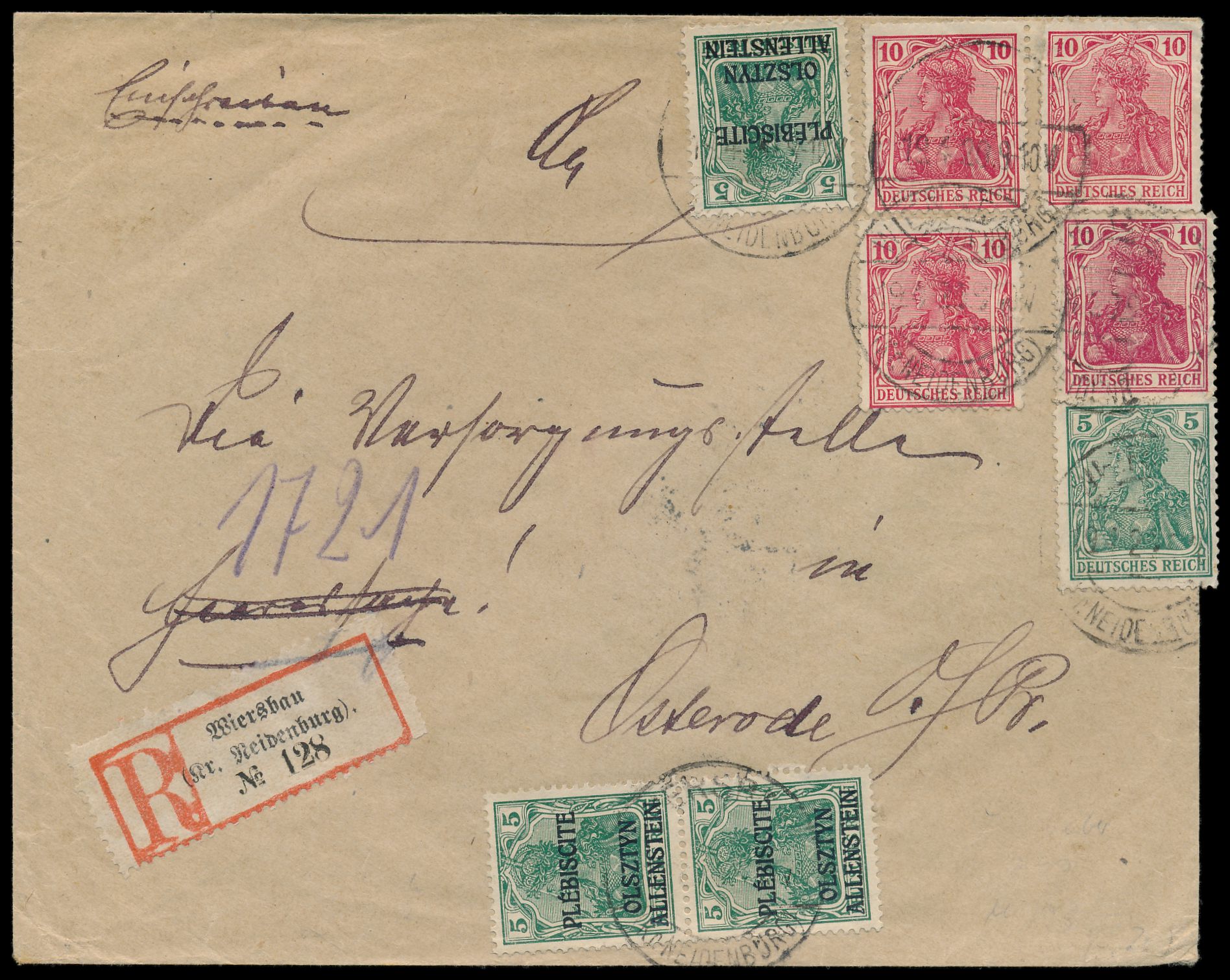 Mischfrankatur 3 x 1. Ausgabe 5 Pf. mit Mitläufer Dt. Reich 5 Pf. und 4 x 10 Pf. (3 x etwas über den Briefrand frankiert, dadurch kleine Beanstandungen) auf Einschreibbrief 2. Gewicht, Stempel Wiersbau (Kr. Neidenburg) 19.4.20, nach Osterode, rückseitig Gemeinde-Dienstsiegel und Ankunftstempel 20.4.20, portorichtig, Bedarf