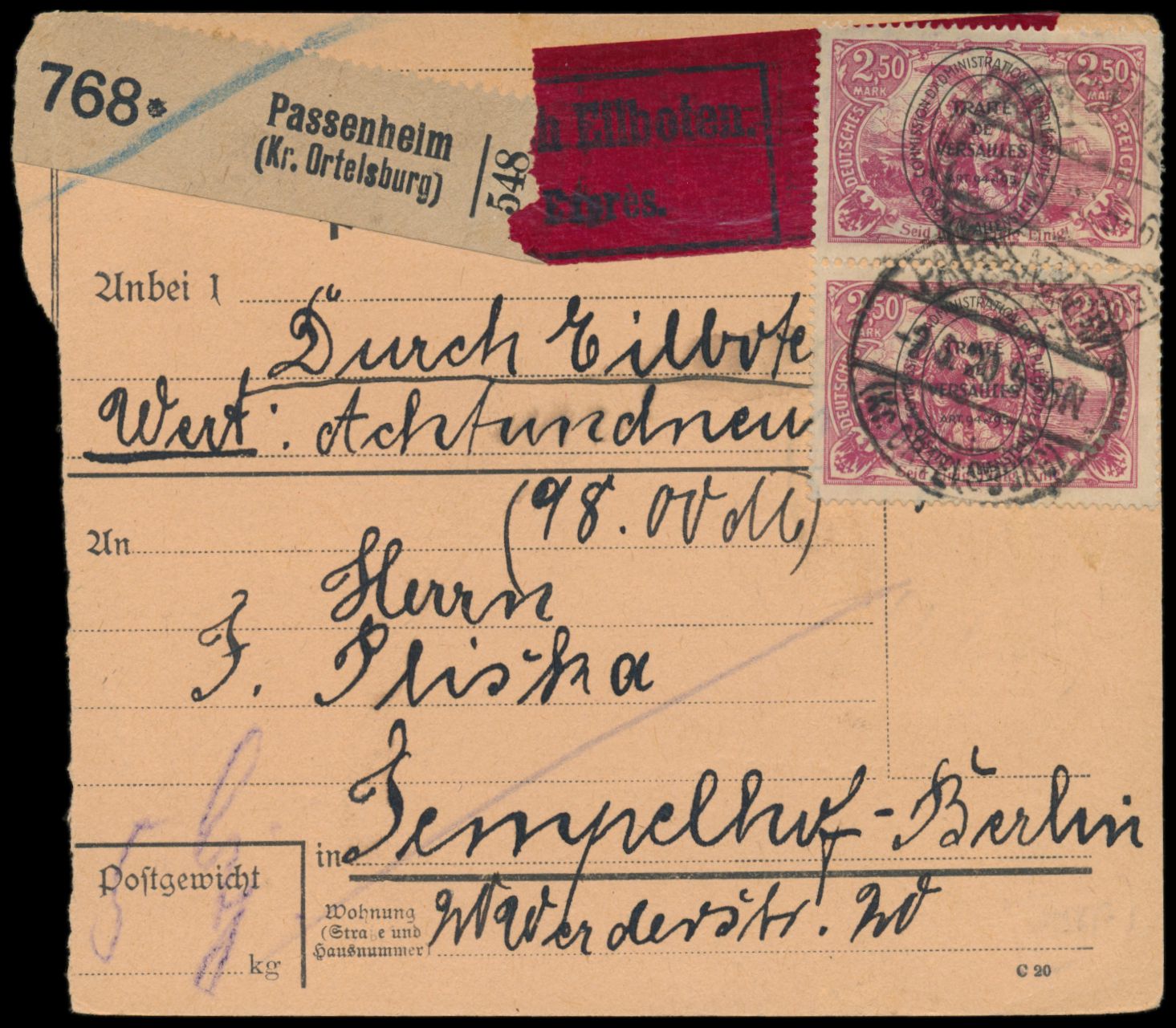 2. Ausgabe 2 x 2,50 M. (1 x Zahnmängel durch Randklebung) auf Eilboten-Paketkarte mit Wertangabe 98 Mark, Stempel des Postamts III. Klasse Passenheim (Kr. Ortelsburg) 2.6.20, nach Berlin-Tempelhof, Ankunftstempel 6.6.20