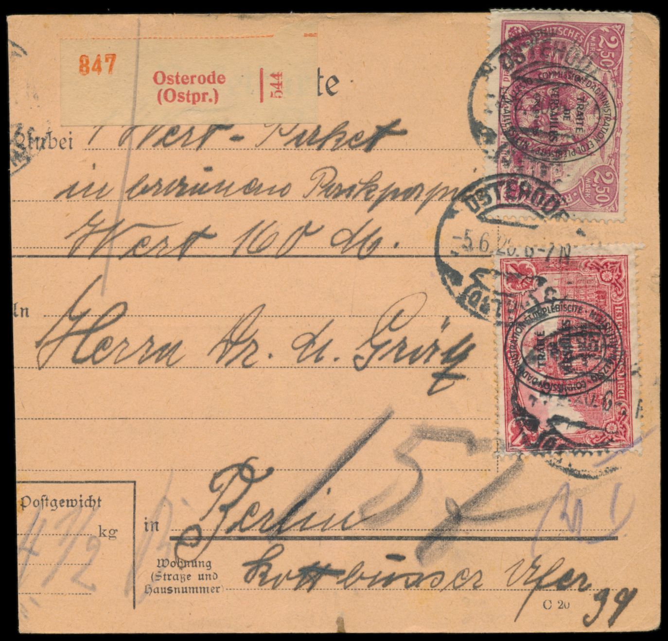 2. Ausgabe 1 M. und 2,50 M. auf Wert-Paketkarte mit Wertangabe 160 M., roter Wert-Nummernzettel, Stempel Osterode (Ostpr.) c 5.6.20, nach Berlin, Aushändigungsvermerk 14.6., geprüft Infla Berlin