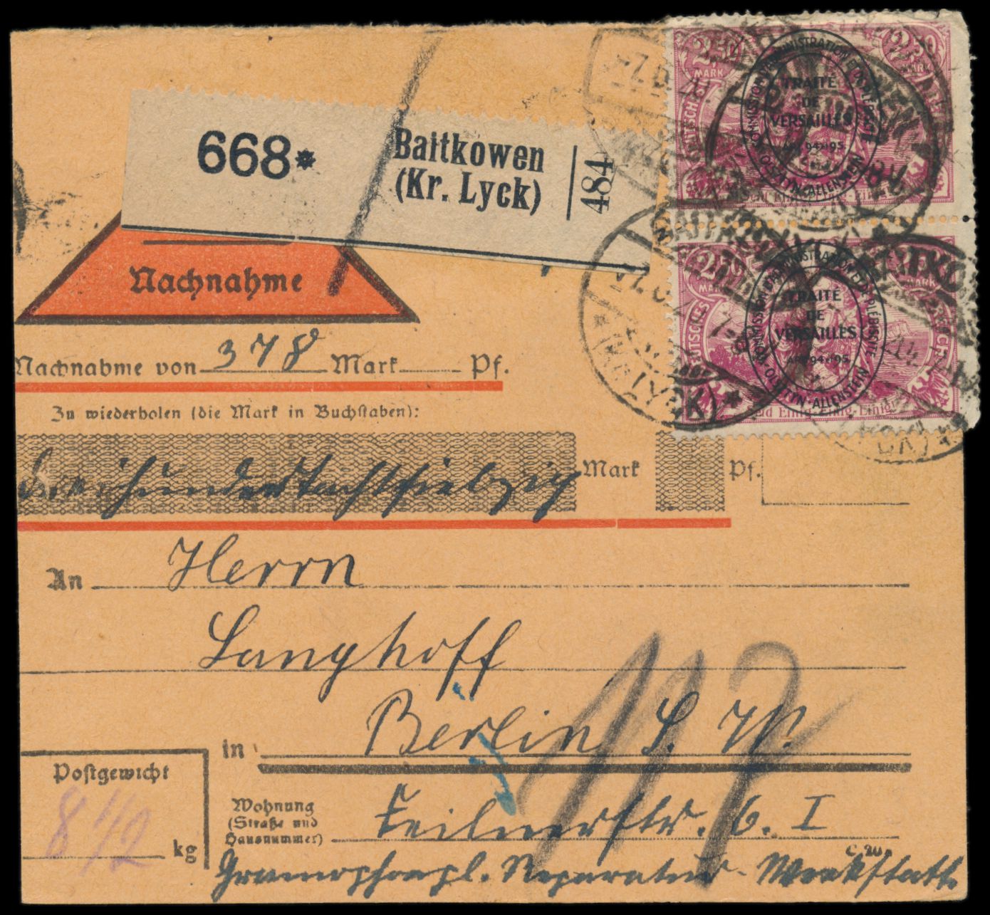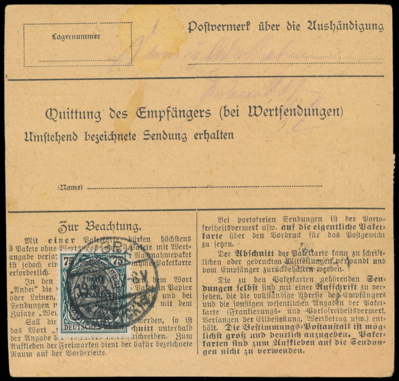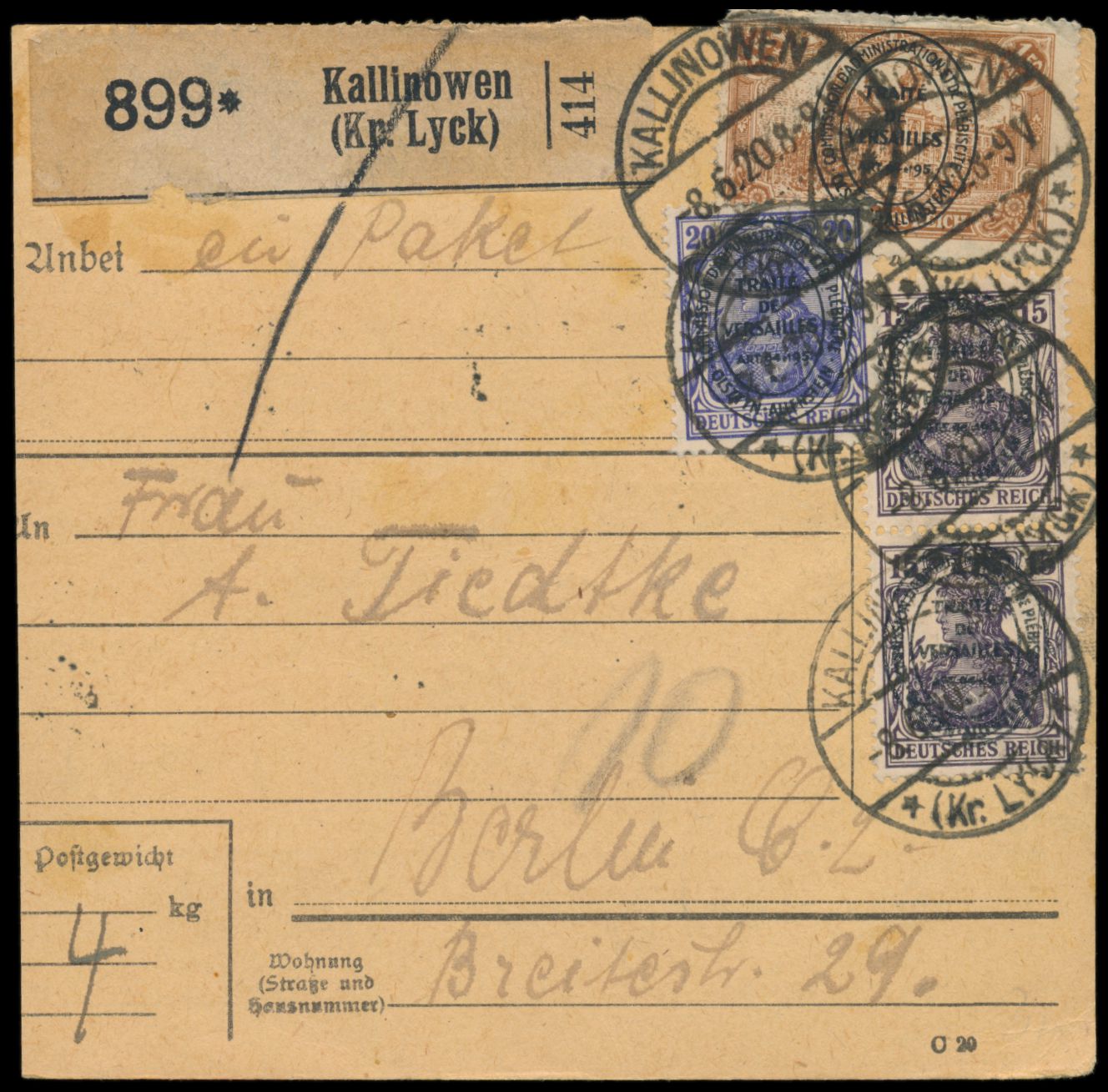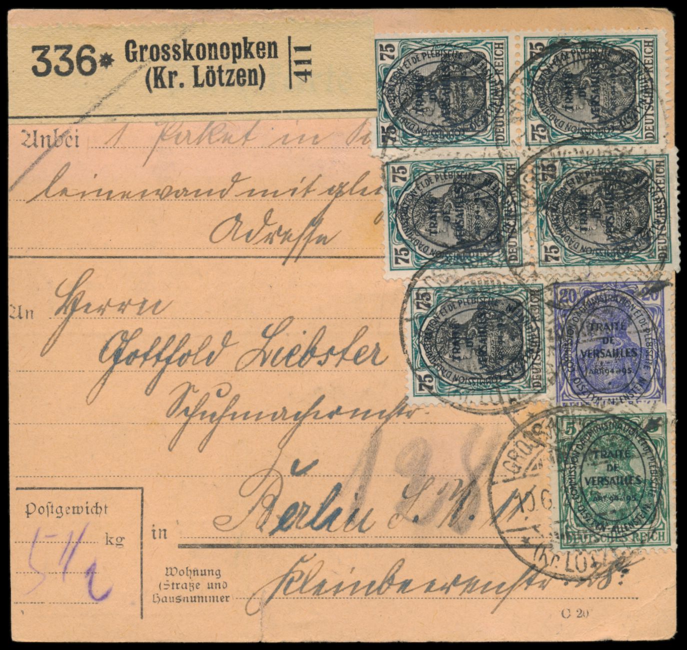 2. Ausgabe 5 Pf., 20 Pf. und 5 x 75 Pf. komplett vorderseitig auf Paketkarte, seltener Postagentur-Stempel Grosskonopken (Kr. Lötzen) 10.6.20 nach Berlin, Aushändigungsvermerk 14.6.