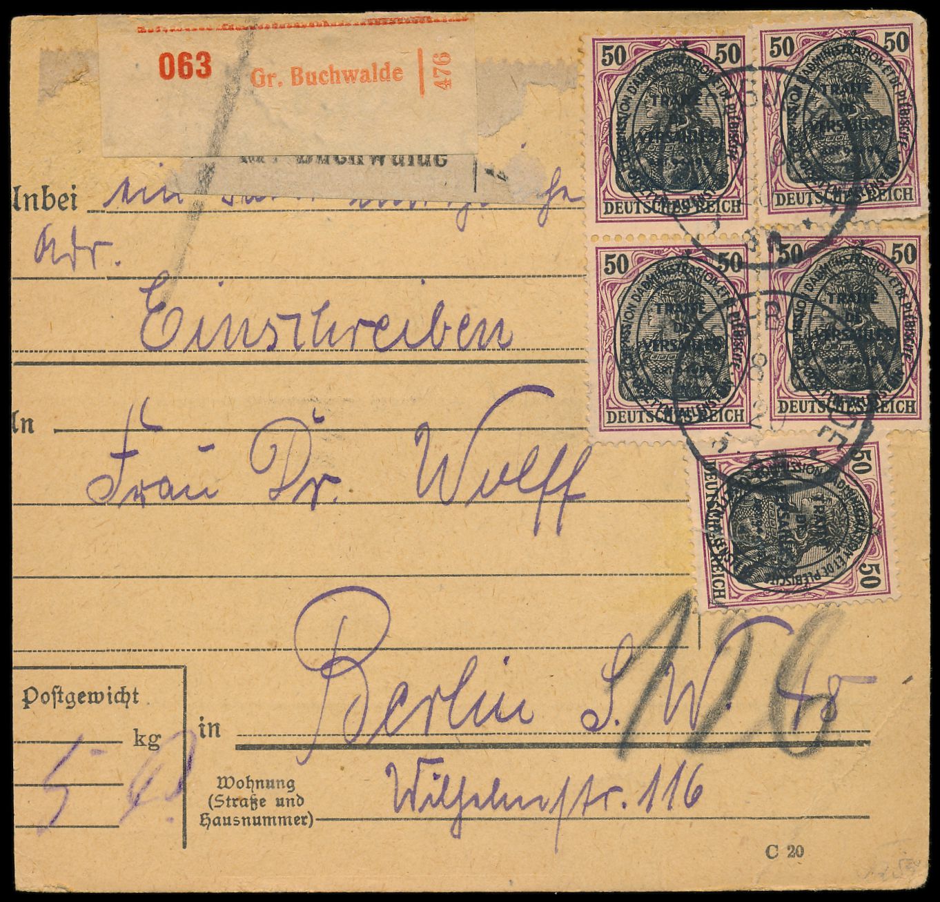 2. Ausgabe 5 x 50 Pf. (2 Marken durch Randklebung beschädigt) vorderseitig auf Wert-Paketkarte mit rotem Wert-Nummernzettel (einfacher Nummernzettel teilweise entfernt und überklebt), seltener Einkreisstempel der Postagentur Gross-Buchwalde 8.6.20, nach Berlin, Aushändigungsvermerk 14.6.