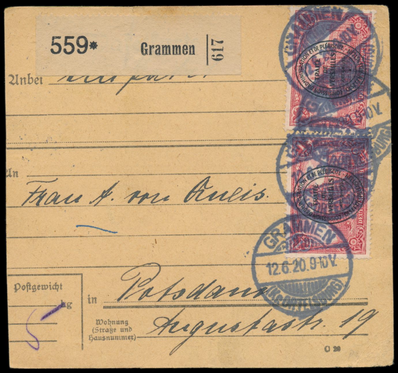 2. Ausgabe 2 x 1 M. auf Paketkarte mit seltenem Stempel der Postagentur Grammen (Kr. Ortelsburg) 12.6.20 nach Potsdam, Ankunftstempel 17.6.20
