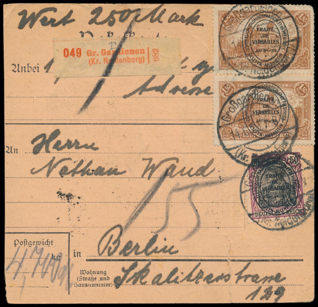 2. Ausgabe 50 Pf. und 2 x 1,50 M. (1 x Zähnung bestoßen) vorderseitig auf Wert-Paketkarte mit Wertangabe 250 Mark, roter Wert-Nummernzettel, seltener Stempel Großgardienen (Kr. Neidenburg) 14.6.20, nach Berlin, Aushändigungsvermerk 21.6., geprüft Infla Berlin, Karte hat unten 2,5 cm Einriss