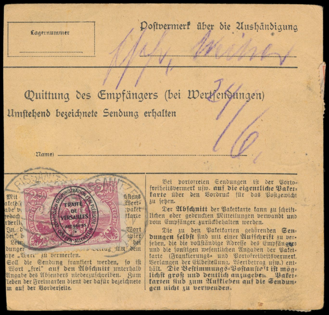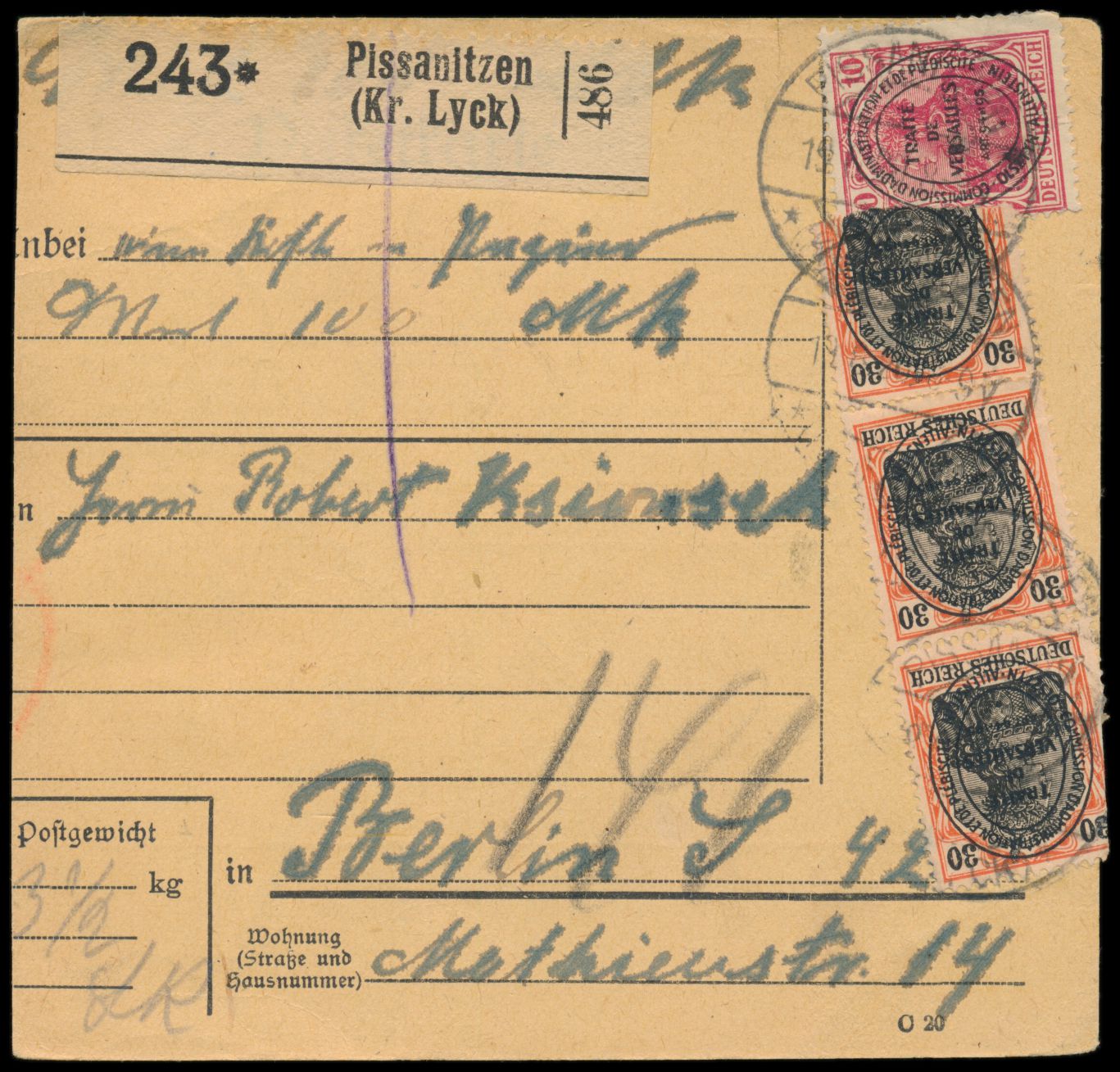 2. Ausgabe 10 Pf., 3 x 30 Pf. vorderseitig und 2,50 M. rückseitig auf Paketkarte mit Wertangabe 100 Mark, sehr seltener Postagentur-Stempel Pissanitzen (Kr. Lyck) 19.6.20 (Gruber 200 P.), nach Berlin, Aushändigungsvermerk 24.6., drei Marken beschädigt