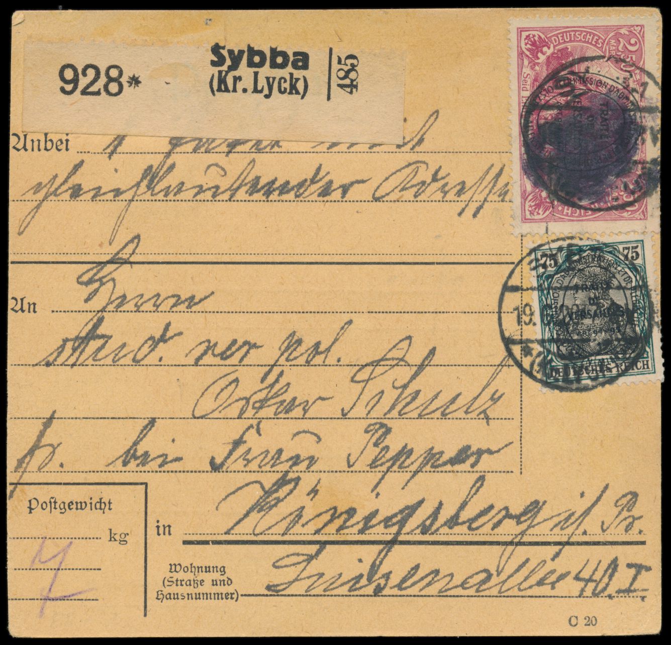 2. Ausgabe 2 x 75 Pf. (1 x rückseitig) und 2,50 M. auf Paketkarte mit seltenem Postagentur-Stempel Sybba (Kr. Lyck) 19.6.20 nach Königsberg, 2,50 m. zusätzlich unförmiger Klecksstempel, handschriftlicher Aushändigungsvermerk 20.6.