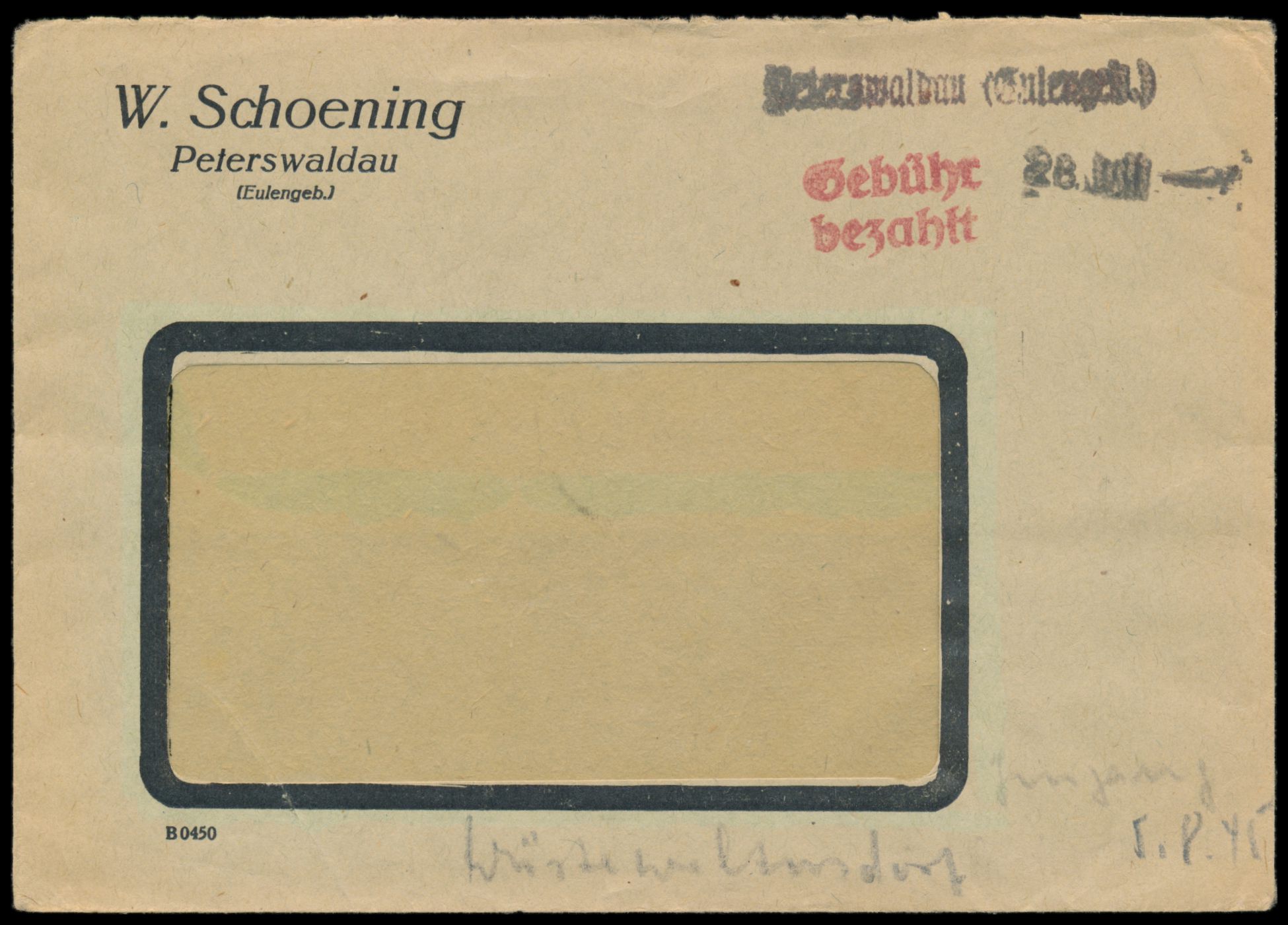 Deutsche Postverwaltung in Niederschlesien: seltener schwarzer Not-L1 Peterswaldau (Eulengeb.) mit Datum-L1 28. Juli (1945) und rotem R2 Gebühr bezahlt auf Firmen-Fensterumschlag, rückseitig stummer Ankunftstempel 5.8.45 (von Wüstewaltersdorf) und vorderseitig handschriftlicher Ankunftsvermerk "Eingang 5.8.45 Wüstewaltersdorf", Bedarf