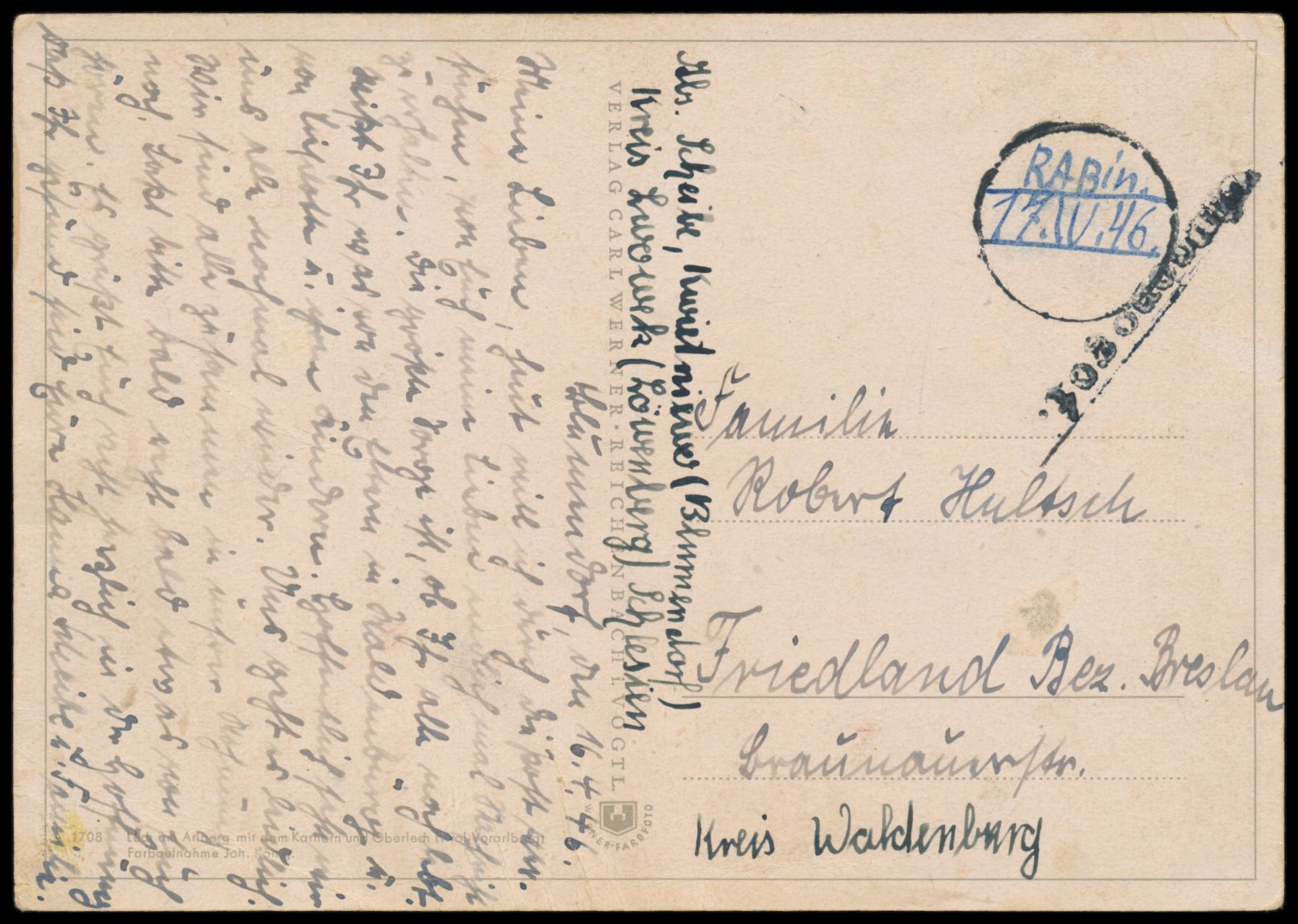 Postkarte mit handschriftlichem Aufgabevermerk "Rabin. 17.IV.46" in einem gestempeltem Kreis und polnischem Barfrankierungsstempel nach Friedland (Bez. Breslau), Absenderangabe "... Kwietniewo (Blumendorf), Kreis Lwowek (Löwenberg), Schlesien", Text in deutscher Sprache, schwacher unauffälliger Bug, Bedarf
