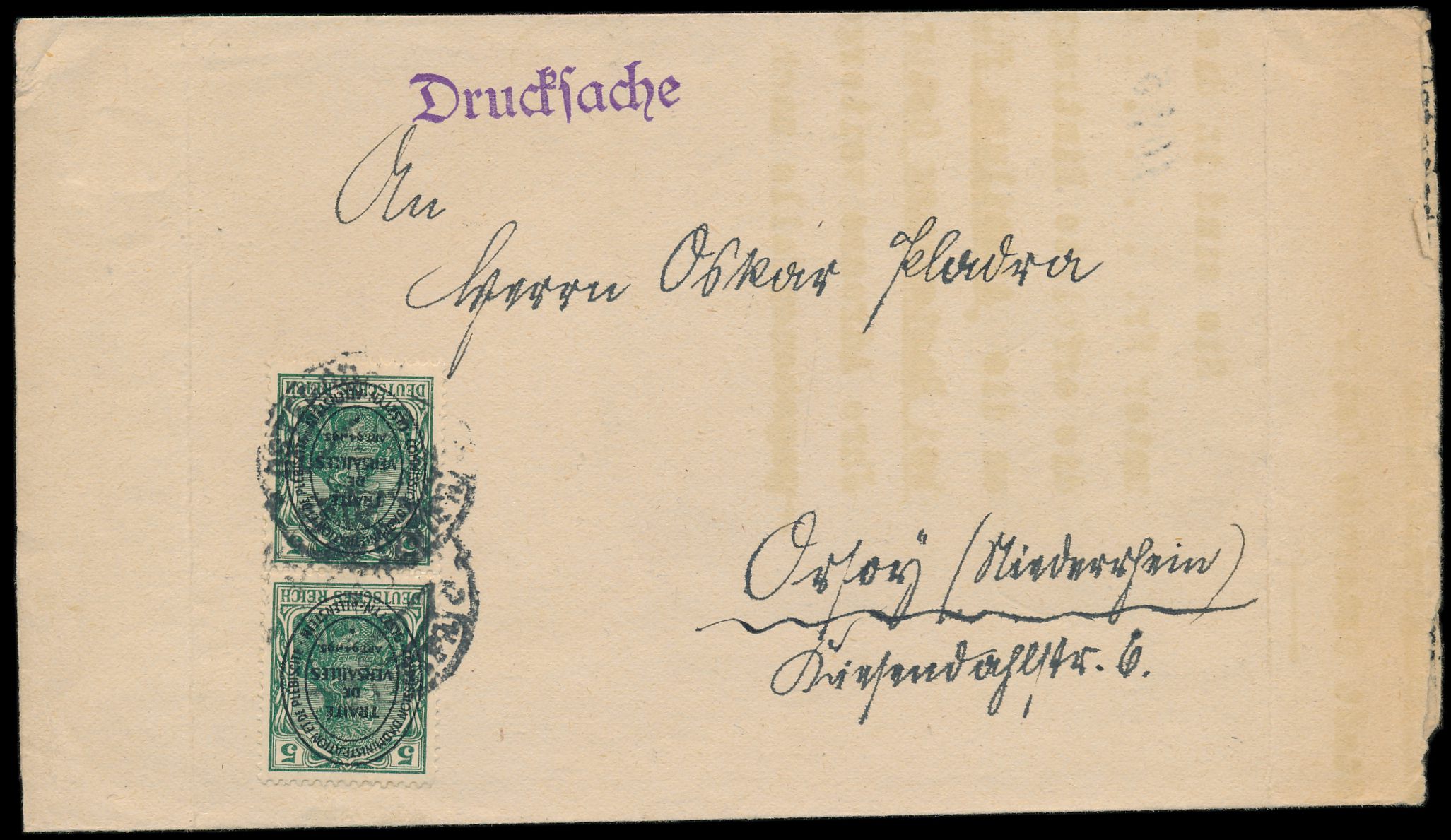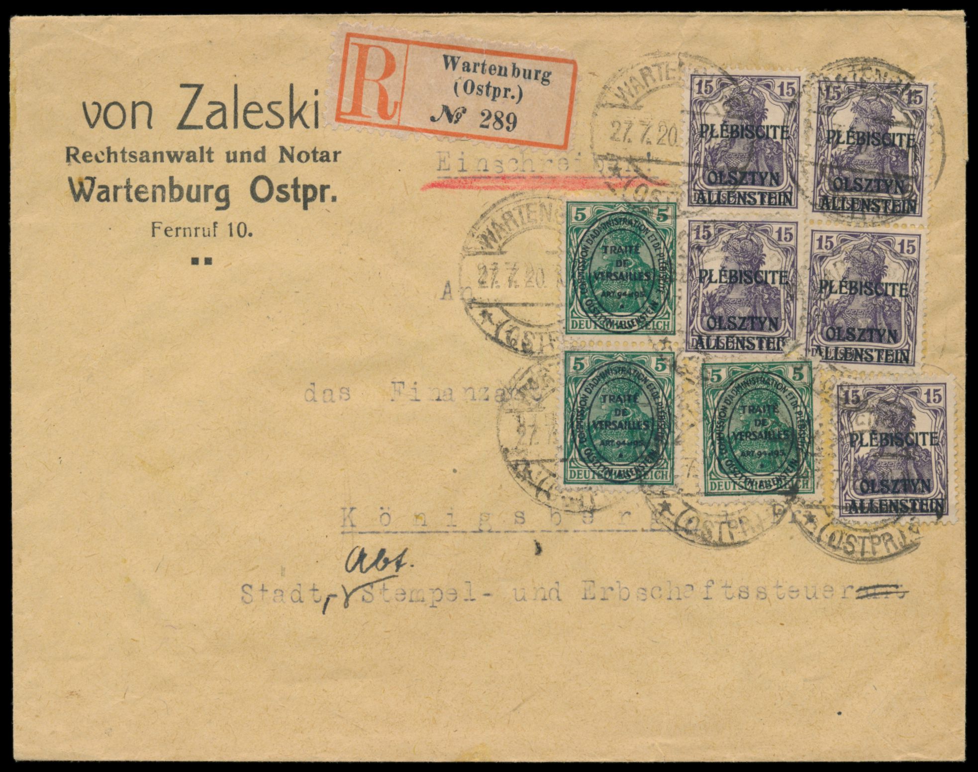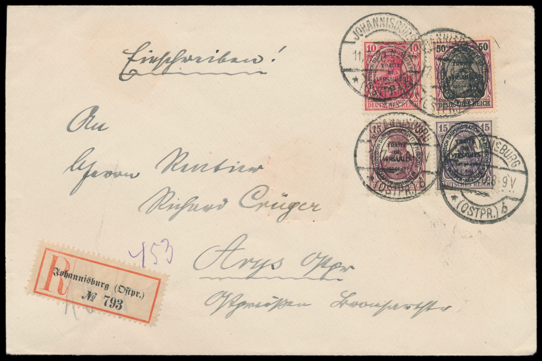 Mischfrankatur 10 Pf., 15 Pf. violett und 15 Pf. braun und 50 Pf. auf Einschreibbrief mit Stempel Johannisburg (Ostpr.) b 11.7.20 nach Arys, seltener Stempel Arys Truppenlager 11.7.20 als Ankunftstempel, portorichtig