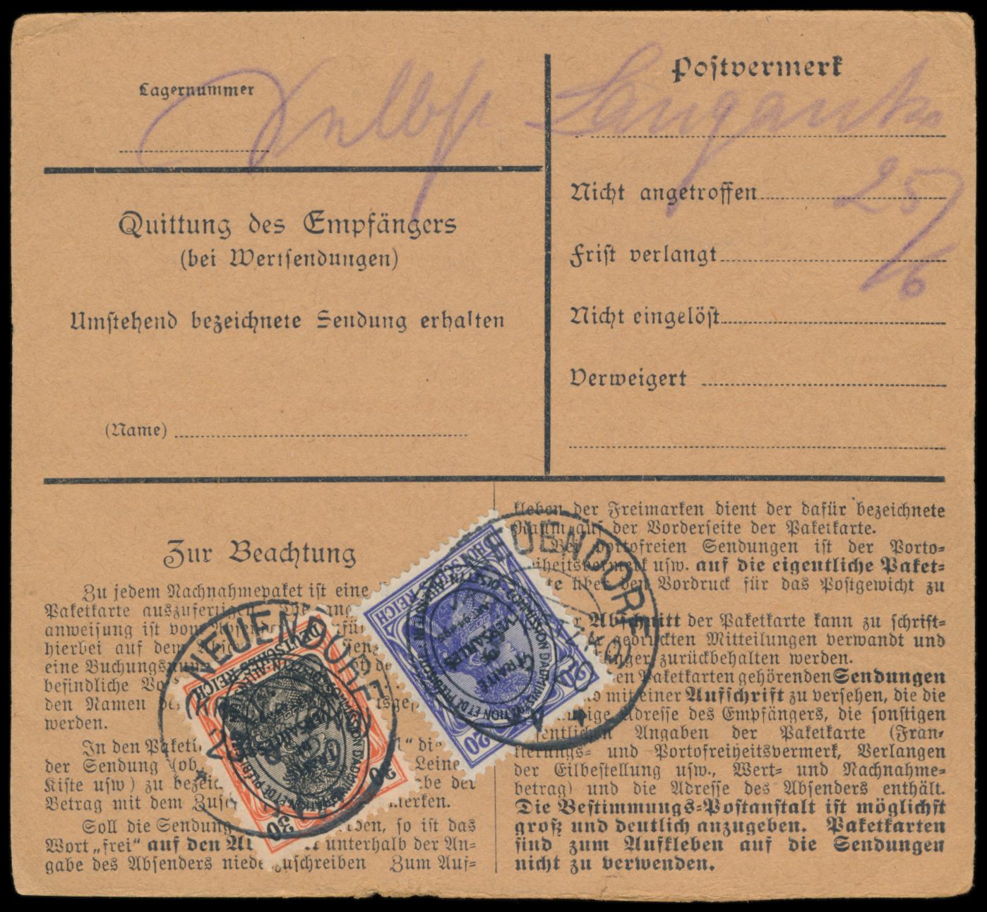 2. Ausgabe 2,50 M. und 20 Pf. und 30 Pf. (rückseitig) auf Nachnahme-Paketkarte mit Postagentur-Stempel Neuendorf (Kr. Oletzko) 23.6.20, 2,50 M. zusätzlich mit unförmigem Klecksstempel, nach Königsberg, Aushändigungsvermerk 25.6.