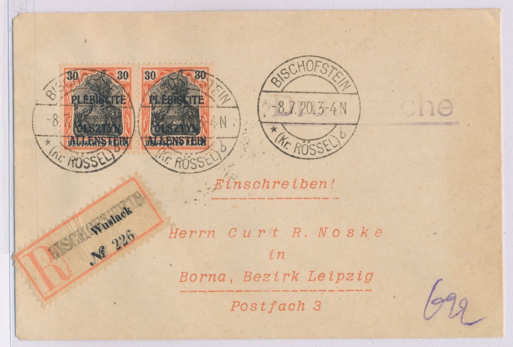 1. Ausgabe 30 Pf. im waagerechtem Paar auf Einschreibbrief an Noske in Borna, Stempel Bischofstein (Kr. Rössel) b 8.7.20, R-Zettel Wuslack mit Formular-L1 überstempelt, Ankunftstempel 10.7.20