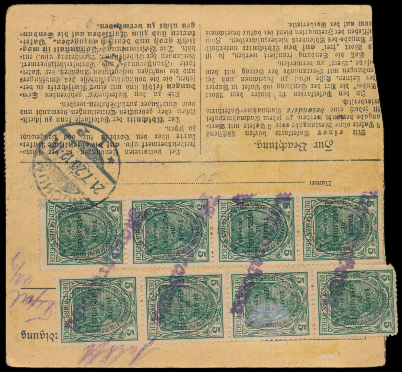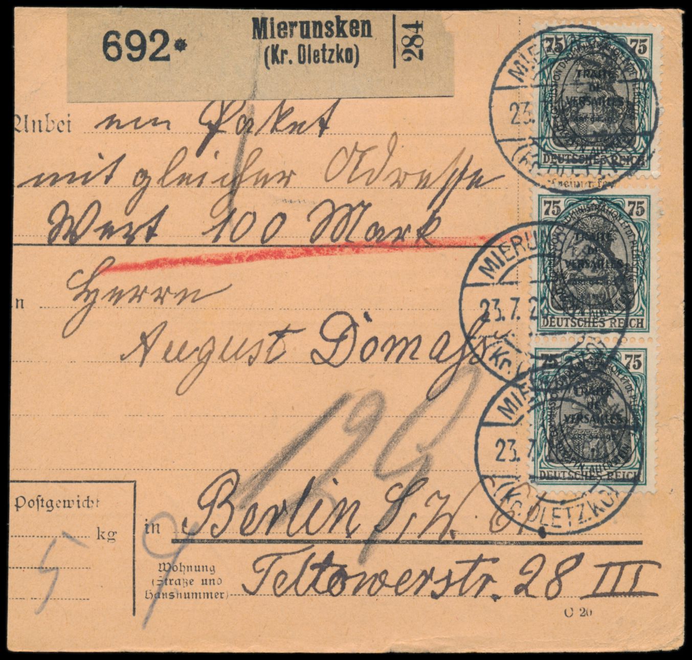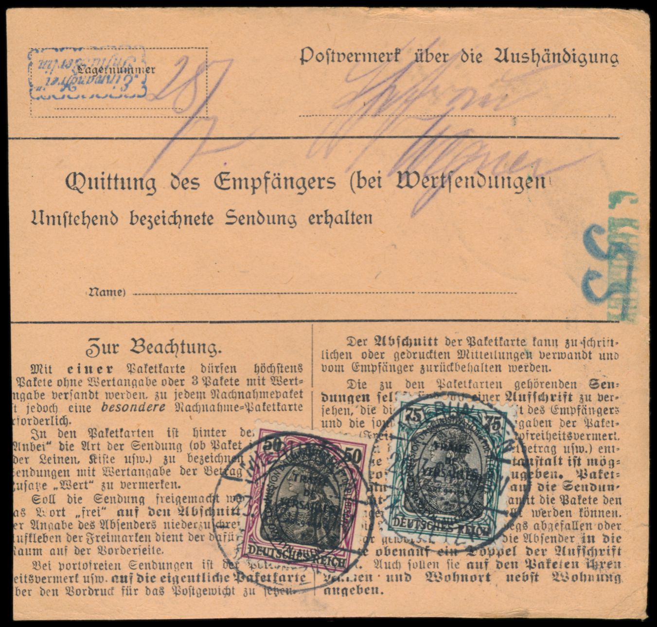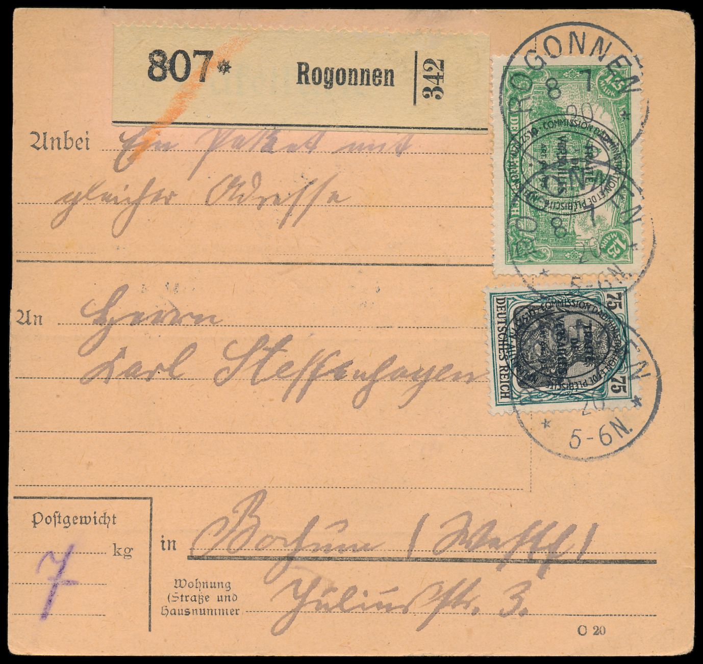 2. Ausgabe 75 Pf. und 1,25 M. auf Paketkarte mit Einkreisstempel der Postagentur Ragonnen 8.7.20, nach Bochum, Ankunftstempel 15.7.20