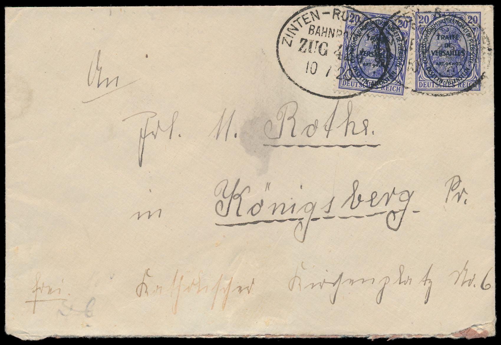 Bahnpoststempel Zinten - Rothfließ Zug 424 10.7.20 auf Brief mit 2 x 20 Pf. (2. Ausgabe) nach Königsberg, Bedarf