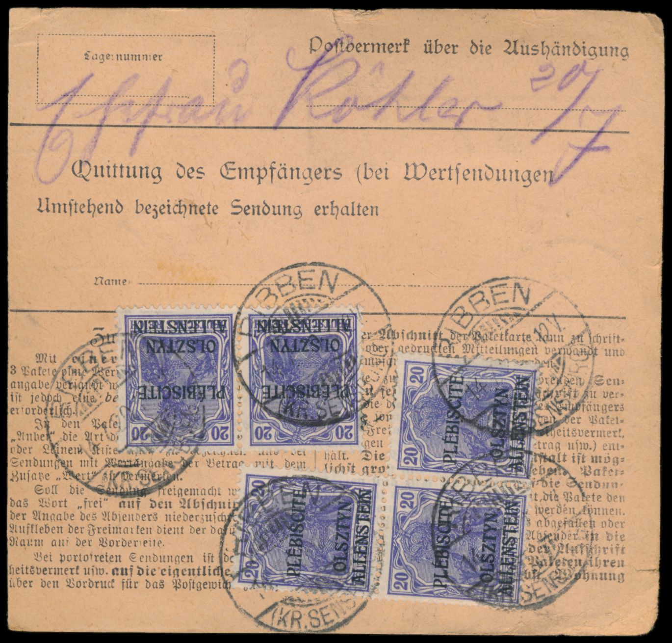 1. Ausgabe 5 x 20 Pf. rückseitig und 2. Ausgabe 5 x 20 Pf. vorderseitig als wertstufengleiche Mischfrankatur auf Paketkarte mit Stempel der Postagentur Ribben (Kr. Sensburg) 14.7.20 nach Berlin, handschriftlicher Ausgabevermerk 20.7.