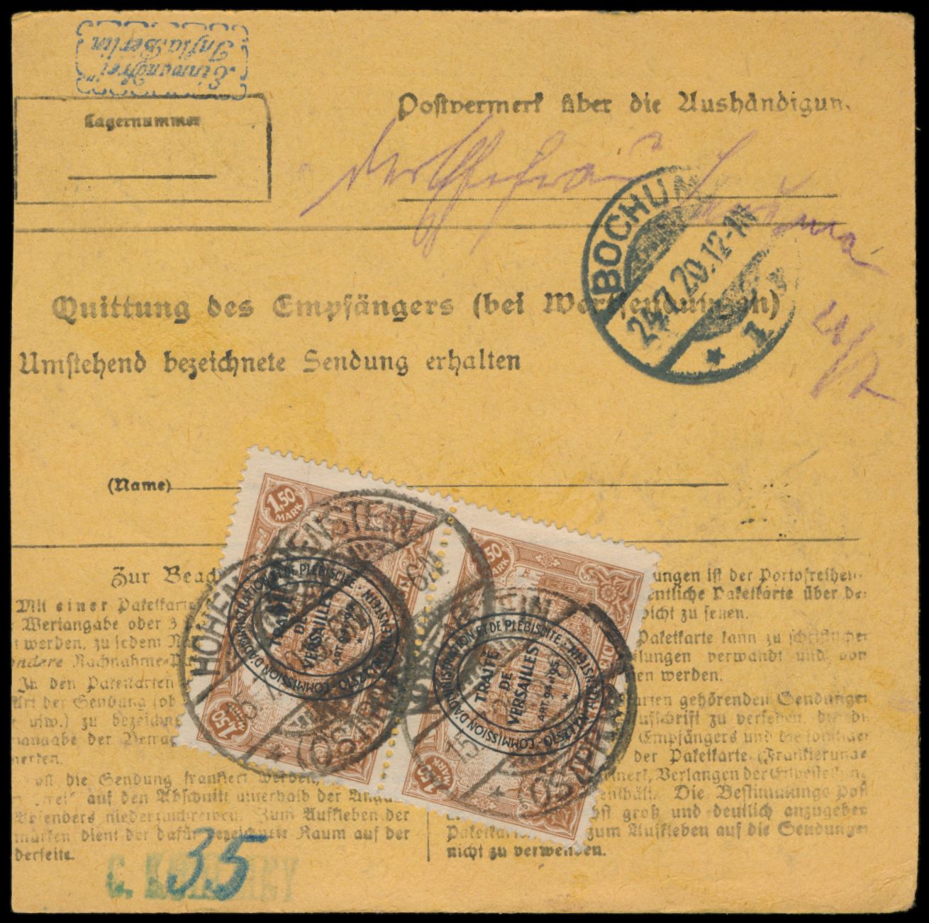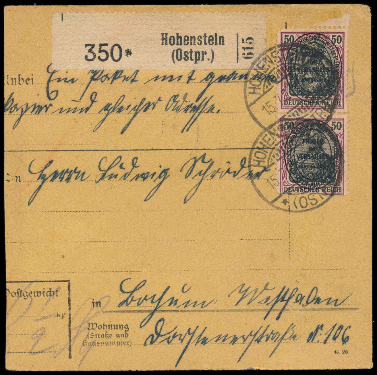 2. Ausgabe 2 x 50 Pf. (vorderseitig) und rückseitig 2 x 1,50 M. auf Paketkarte mit Stempel Hohenstein (Ostpr.) 15.7.20 nach Bochum, Ankunftstempel 24.7.20, geprüft Infla Berlin