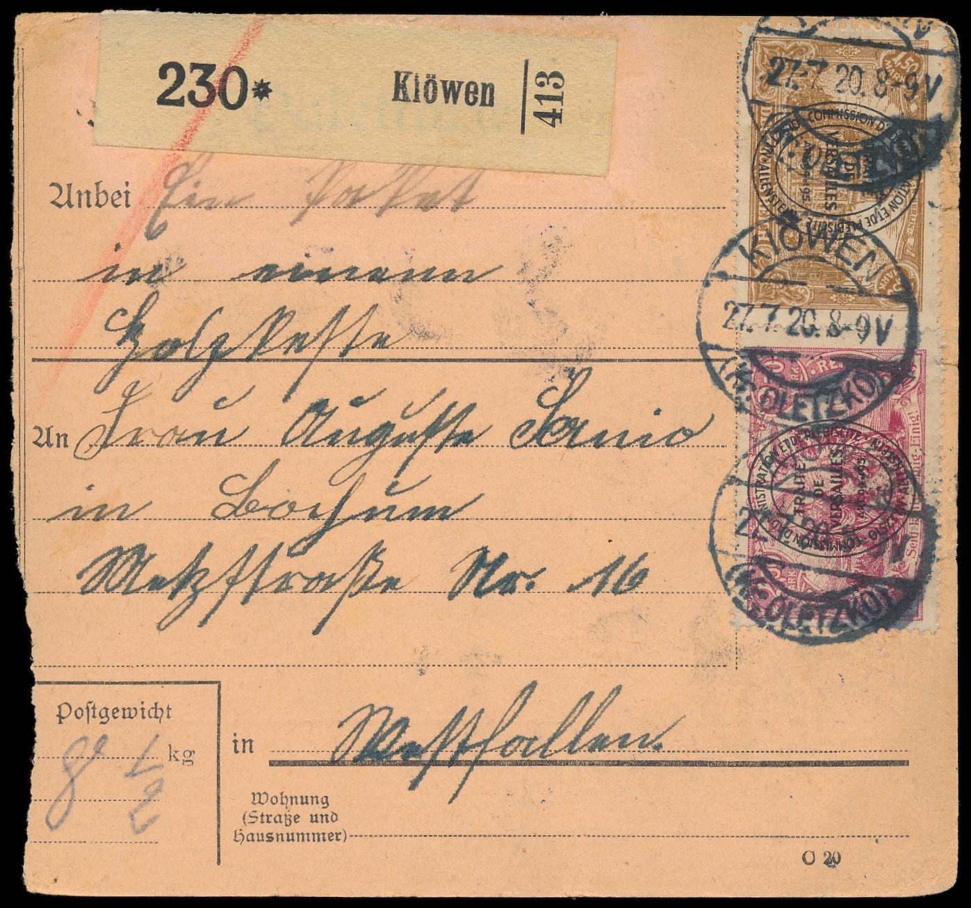 2. Ausgabe 1,50 M. und 2,50 M. auf Paketkarte mit Postagentur-Stempel Kiöwen (Kr. Oletzko) 27.7.20, nach Bochum, Abkunftstempel 3.8.20
