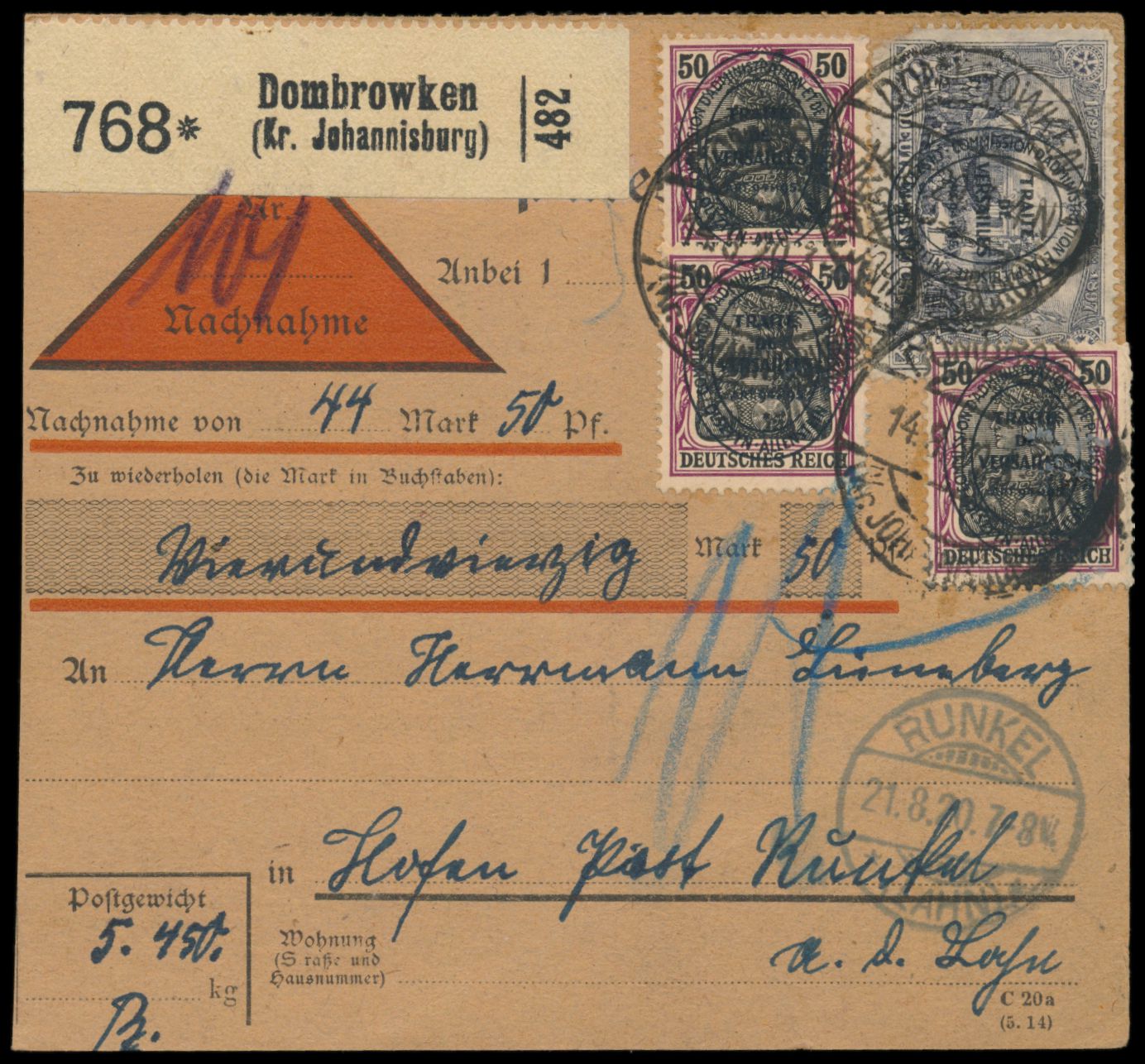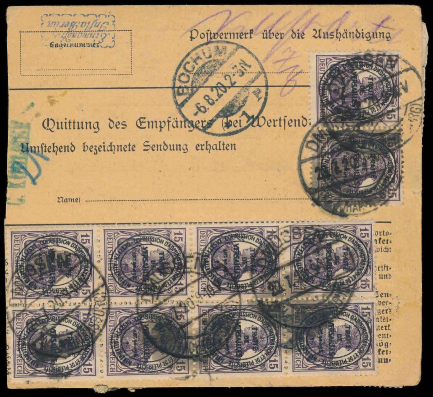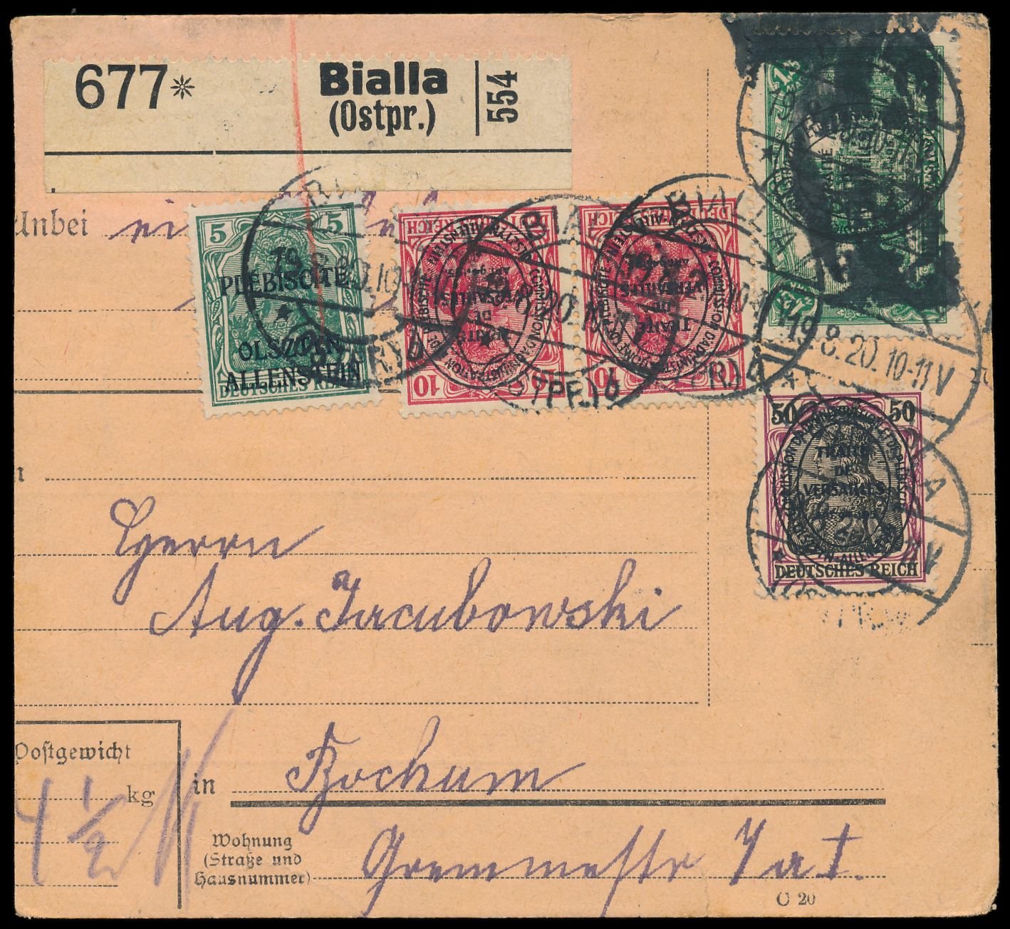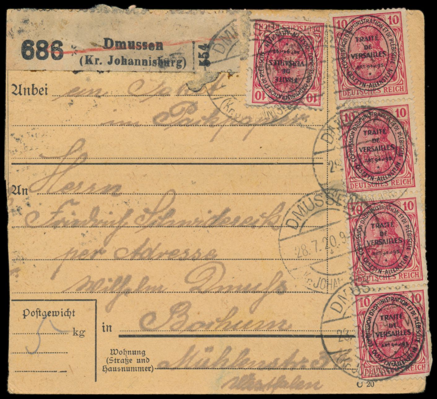 2. Ausgabe 5 x 10 Pf. und 10 x 15 Pf. (rückseitig) auf Paketkarte mit sehr seltenem Stempel der Postagentur Dmussen (Kr. Johannisburg) 28.7.20, nach Bochum, Ankunftstempel 6.8.20, zwei 10 Pf. Marken über den Kartenrand geklebt und beschädigt, geprüft Infla Berlin