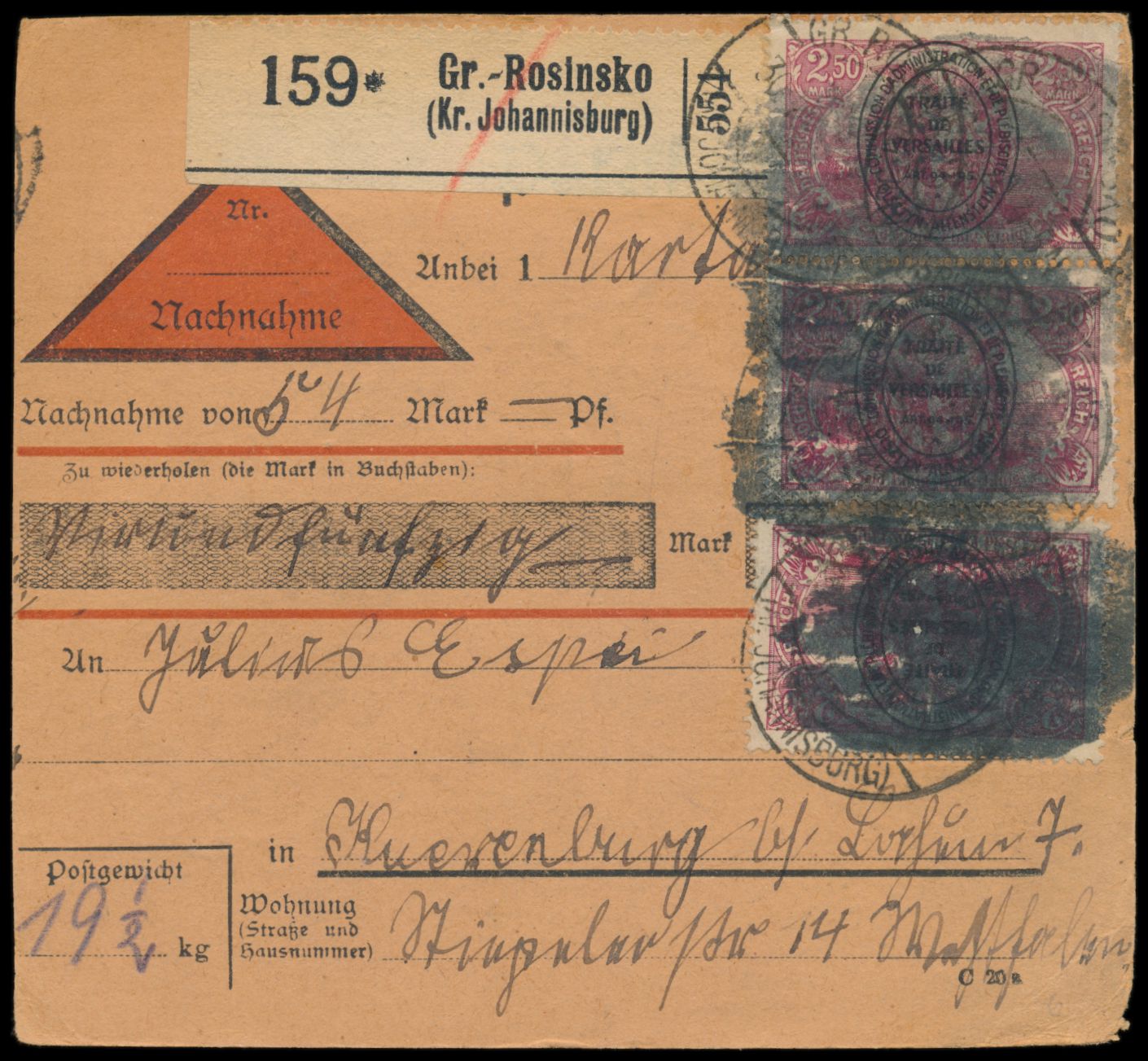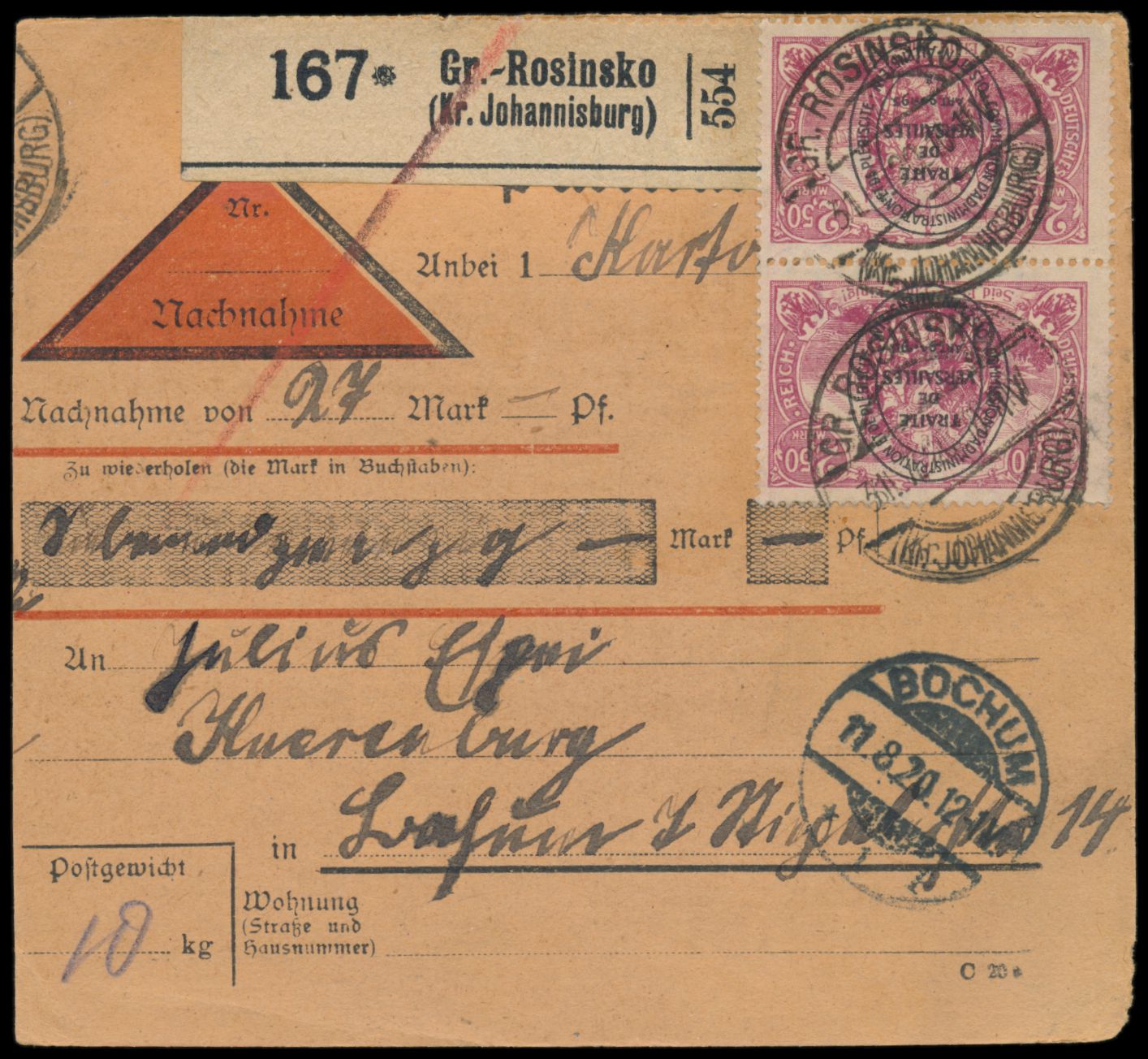 2. Ausgabe 2 x 2,50 M. auf Nachnahme-Paketkarte mit Stempel der Postagentur Gr. Rosinsko (Kr. Johannisburg) 31.7.20 nach Bochum mit vorderseitigem Ankunftstempel 11.8.20