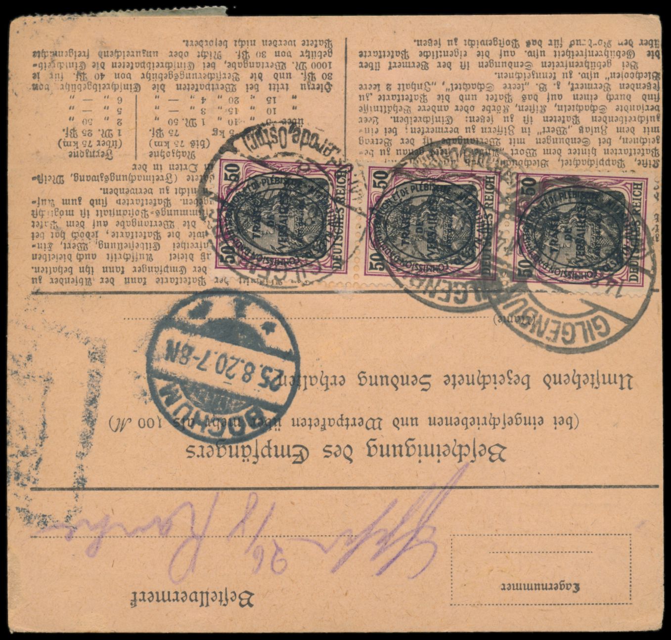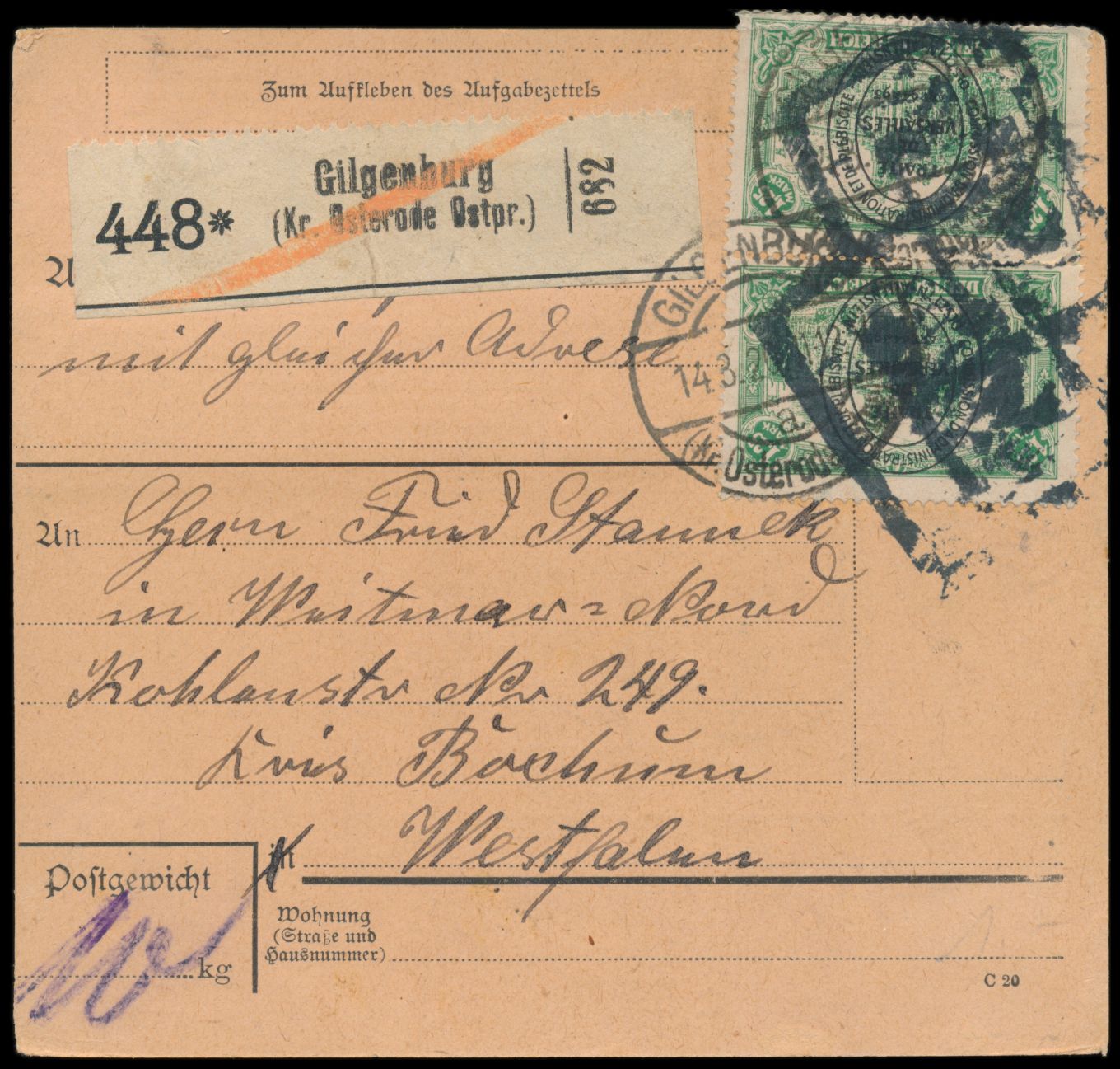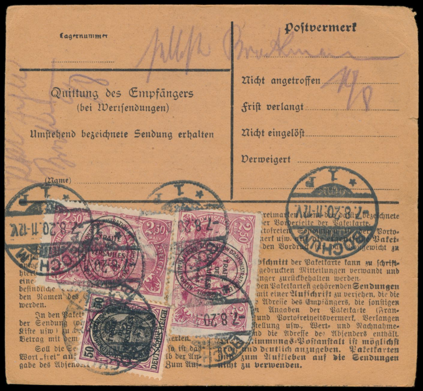 2. Ausgabe 3 x 50 Pf. rückseitig und 2 x 1,25 M. vorderseitig auf Paketkarte mit Stempel des Postamts III. Klasse Gilgenburg (Kr. Osterode, Ostpr.) a 14.8.20, 2 x 1,25 M zusätzlich mit mehreren Abschlägen eines Rechteckstempels entwertet, nach Bochum, Ankunftstempel 25.8.20, eine Marke über den Kartenrand geklebt, dadurch leichte Zahnfehler