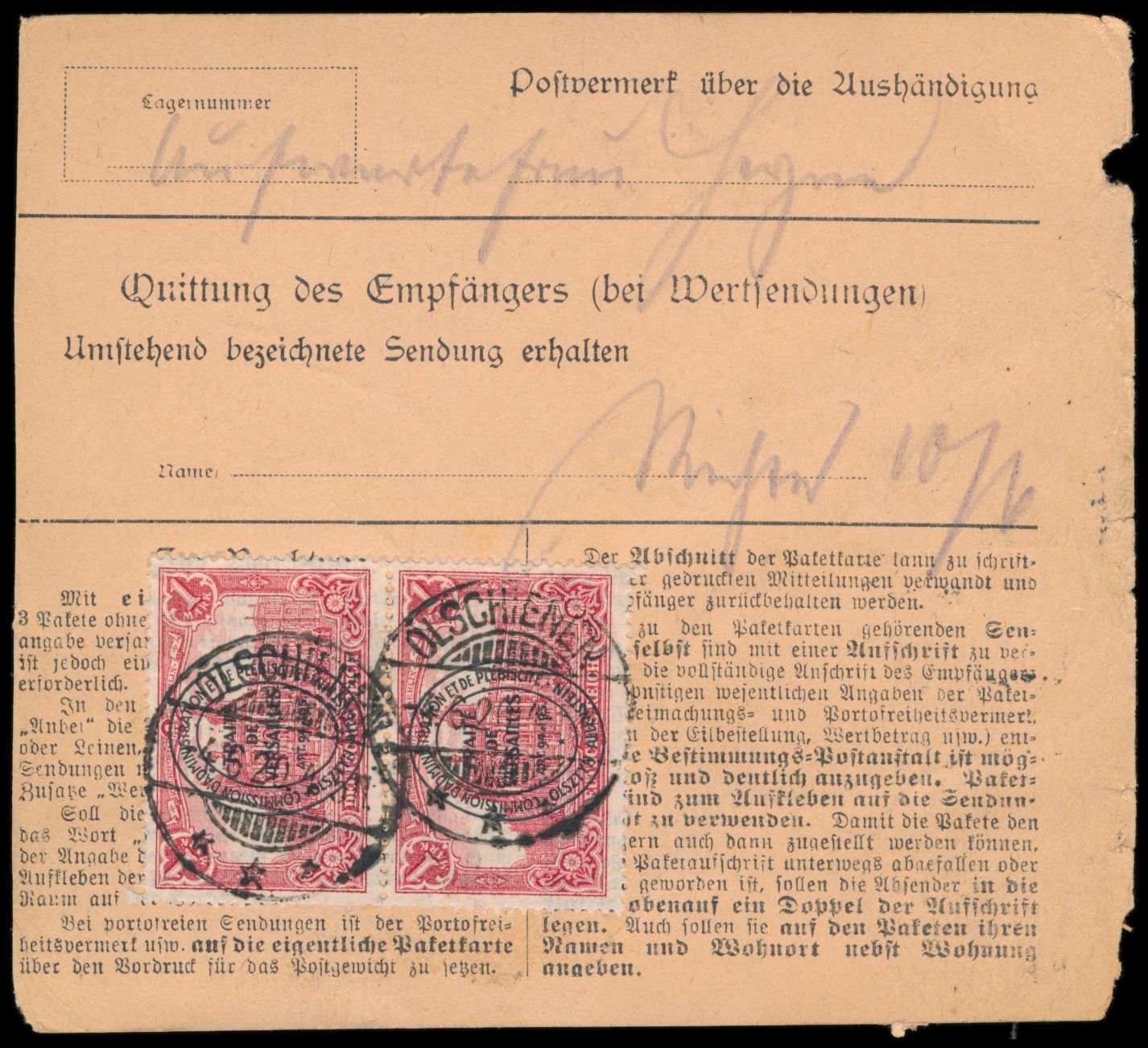 2. Ausgabe 50 Pf. und 3 x 1 M. beidseitig auf Paketkarte mit Wertangabe 90 Mark (vorderseitige Marken beschädigt), sehr seltener Stempel der Postagentur Olschienen 4.8.20 (Gruber 200 P.), nach Chemnitz, Aushändigungsvermerk 10.6.