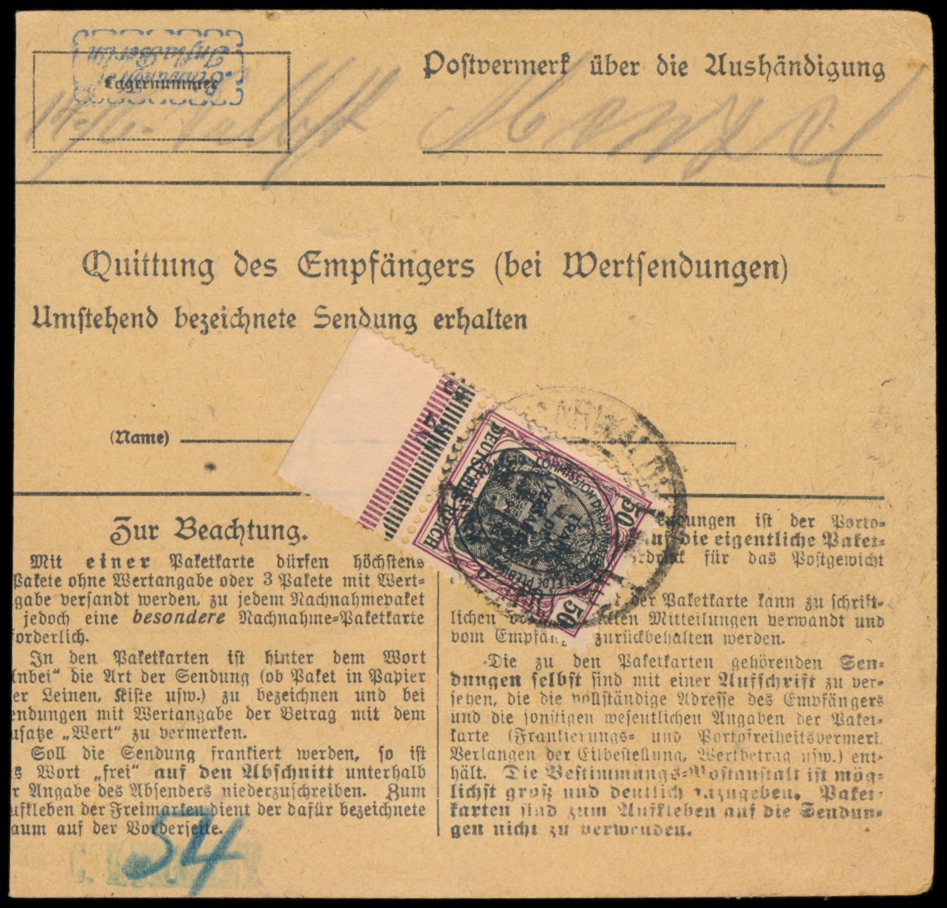 2. Ausgabe 50 Pf. (Unterrandmarke mit Teil-HAN) rückseitig und 1,50 M. vorderseitig auf Paketkarte, seltener Stempel der Postagentur Marwalde (Kr. Osterode, Ostpr.) 5.8.20, nach Berlin, Aushändigungsvermerk 14.8., geprüft Infla Berlin