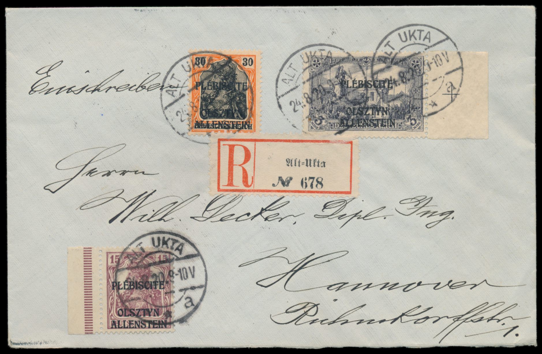 1. Ausgabe 15 Pf., 30 Pf. und 3 M. (rechts Seitenrand mit Passerkreuz) auf Einschreibbrief, Stempel Alt Ukta a 24.8.20, nach Hannover, Ankunftstempel 28.8.20