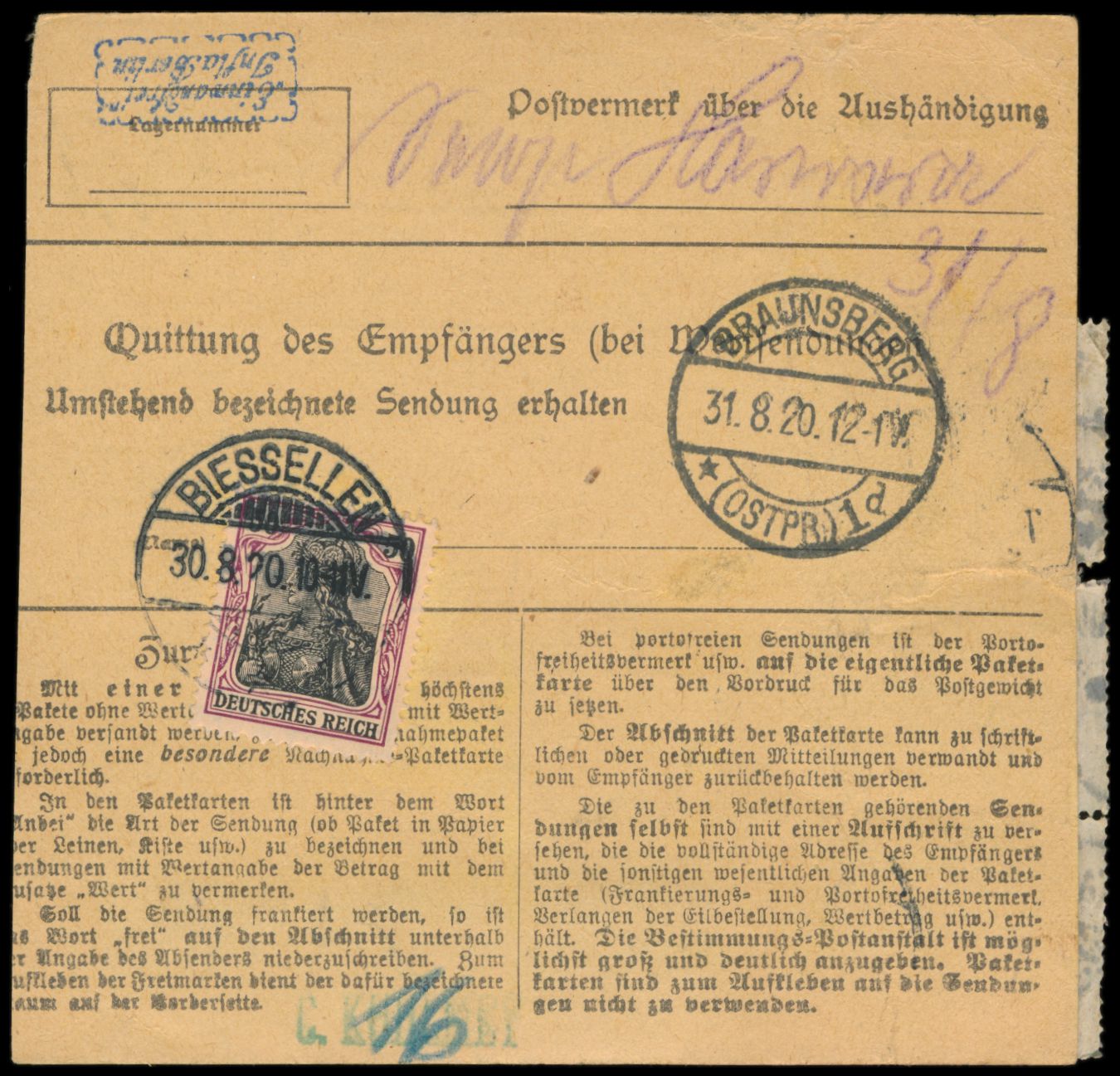 Paketkarte mit vorderseitig 2. Ausgabe 3 x 1,50 M. (über den Rand geklebt, zwei Marken kleine Eckfehler) und rückseitig Dt. Reich 50 Pf., Stempel der Postagentur Biesellen 30.8.20, nach Braunsberg, Ankunftstempel 31.8.20, geprüft Infla Berlin