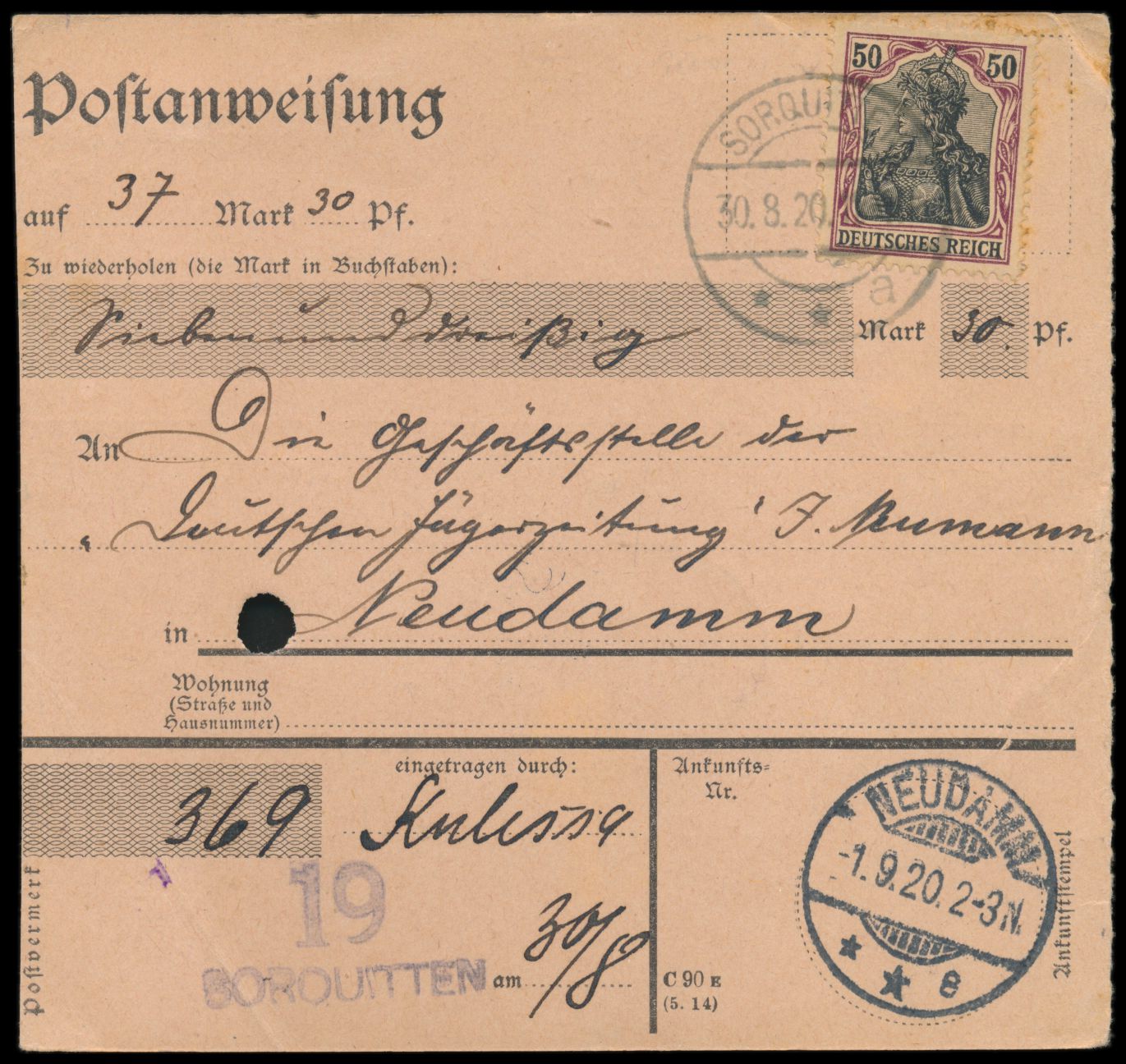 Einzelfrankatur 50 Pf. (ohne Aufdruck, einige Zahnspitzen mit Stockpunkten) während der Verwendungszeit der Aufdruckausgaben auf Postanweisung auf 37 Mark, Stempel Sorquitten a 30.8.20, Ankunftstempel Neudamm 1.9.20