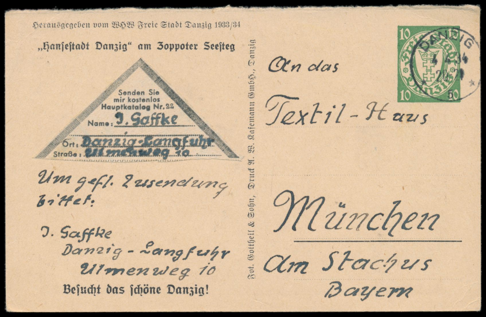 Lotterie-Ganzsache 10 Pf. mit Bild "Hansestadt Danzig am Zoppoter Seesteg", Maschinenstempel Danzig 5 4.4.34, nach München, Bedarf