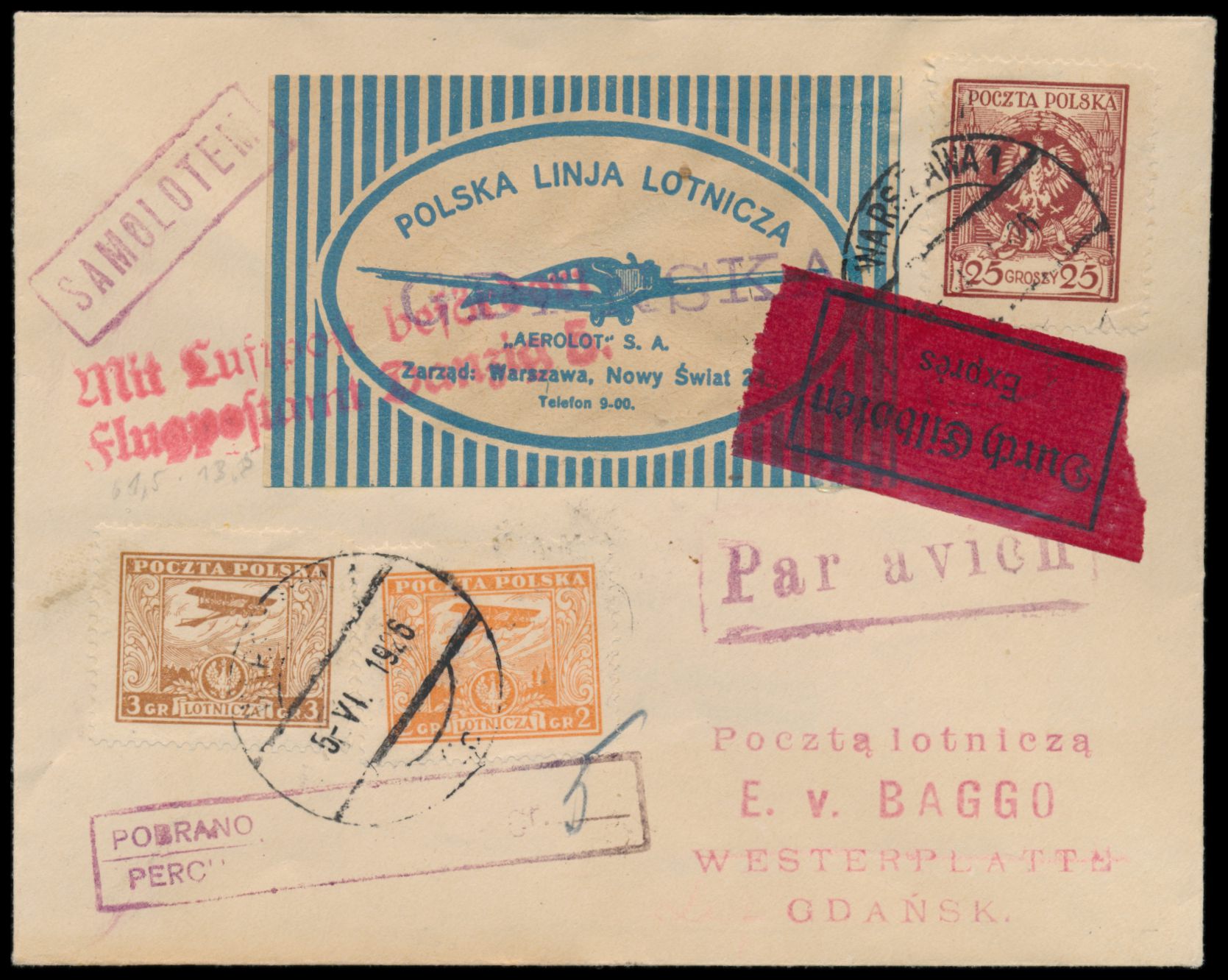 Polen 25 Gr. Wappen (unten winziger Einriss) mit 2 Gr. und 3 Gr. Flugpost auf Luftpost-Drucksache mit Stempel Warszawa 1 5.6.1926 nach Danzig, großer Aerolot-Aufkleber mit violettem L1 "Gdanska" , Luftpostgebührenstempel 5 Gr., roter L2 "Mit Luftpost befördert / Flugpostamt Danzig 5", Ankunftstempel Danzig-Langfuhr 5.6.26