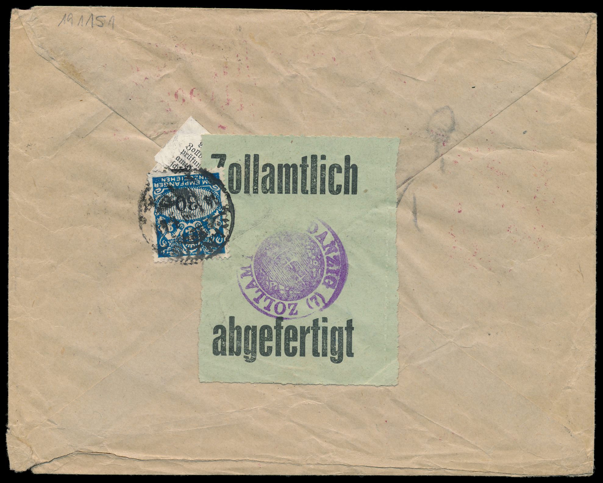 Luftpost-Einschreibbrief aus Riga / Lettland 12.1.29 nach Danzig, rückseitig großer grüner Aufkleber "Zollamtlich abgefertigt" mit Dienstsiegel Zollamt Danzig und kleiner weißer Hinweiszettel, darüber Danzig-Portomarke 30 Pf. (1923, Eckbug) als Verzollungsgebühr, Stempel Danzig 14.1.29, Bedarf