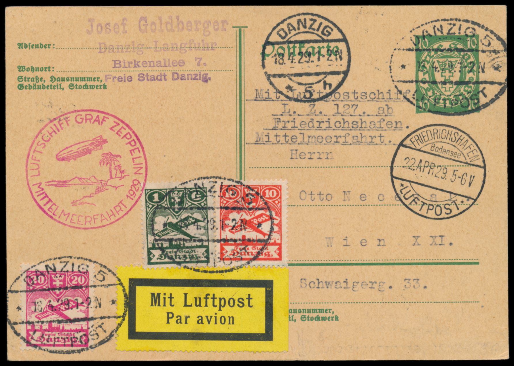 Mittelmeerfahrt LZ 127 23. bis 25.4.1929 mit Danzig-Zuleitung, Abwurf Sevilla, Danzig-Ganzsache 10 Pf. mit Zusatzfrankatur 10 Pf., 20 Pf. und 1 G. Flugpost, Stempel Danzig 5 Flugpost 18.4.29, roter Bestätigungsstempel und Durchgangsstempel Friedrichshafen Luftpost 22.4.29 und Sevilla 24.4.29, nach Wien