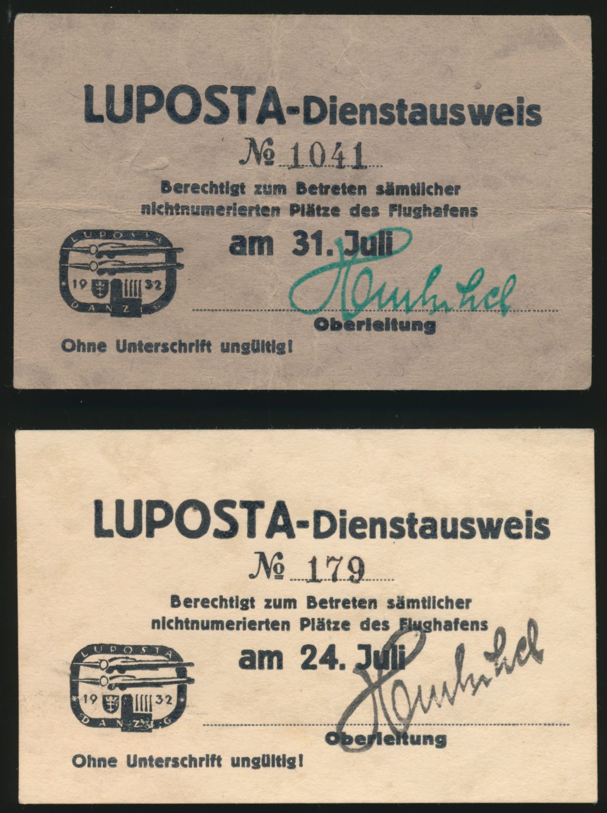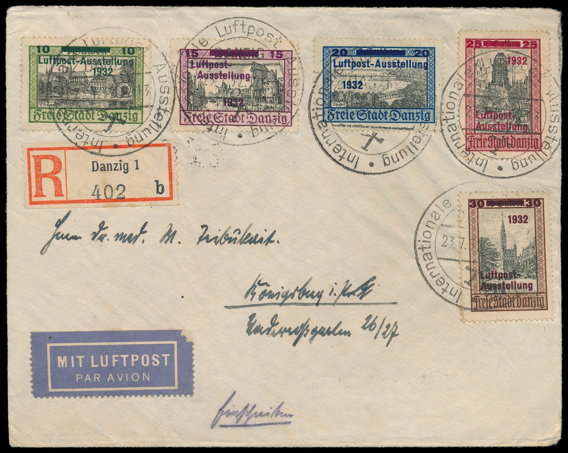 LUPOSTA 1932, kompletter Satz auf Luftpost-Einschreibbrief nach Königberg, Sonderstempel Internationale Luftpost Ausstellung Danzig 23.7.32, Ankunftstempel 23.7.32