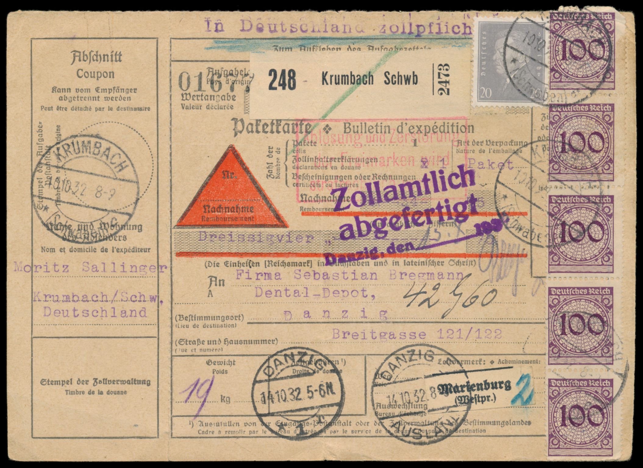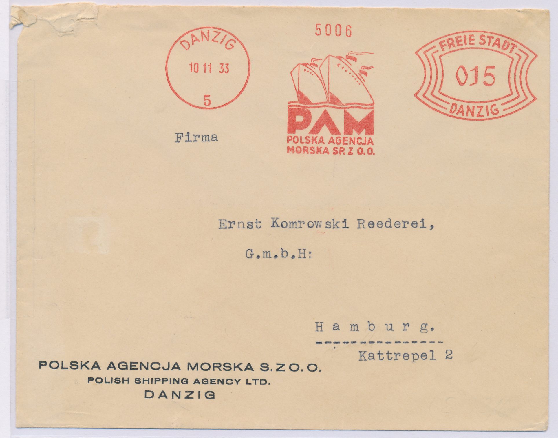 Absenderfreistempel Polska Agencja Morska , Stempelkopf Danzig 5 10.11.33, Bogenrechteck-Wertrahmen 15 Pf., Brief nach Hamburg