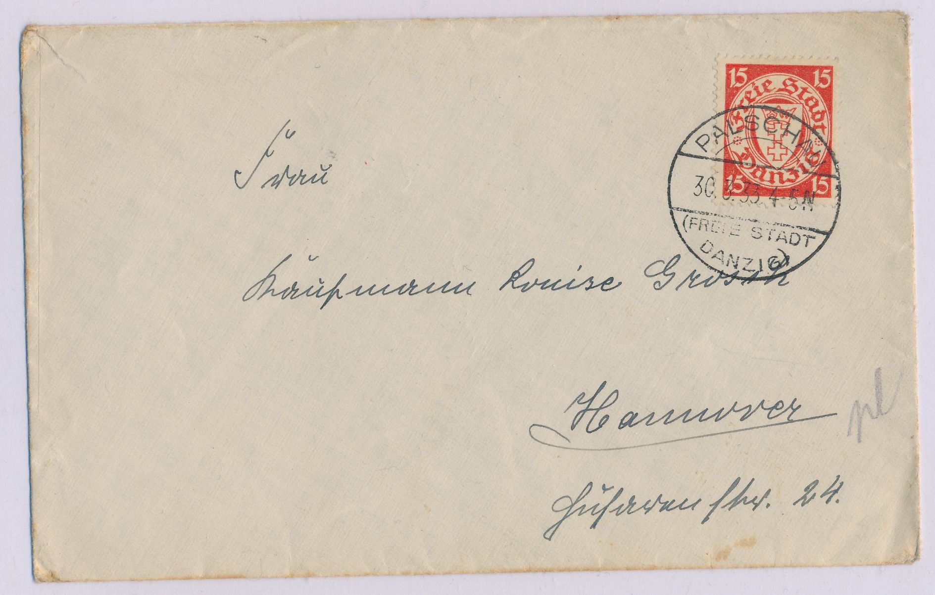 Stempel Palschau (Freie Stadt Danzig) 30.3.33 auf Brief mit 15 Pf. Staatswappen nach Hannover, Bedarf