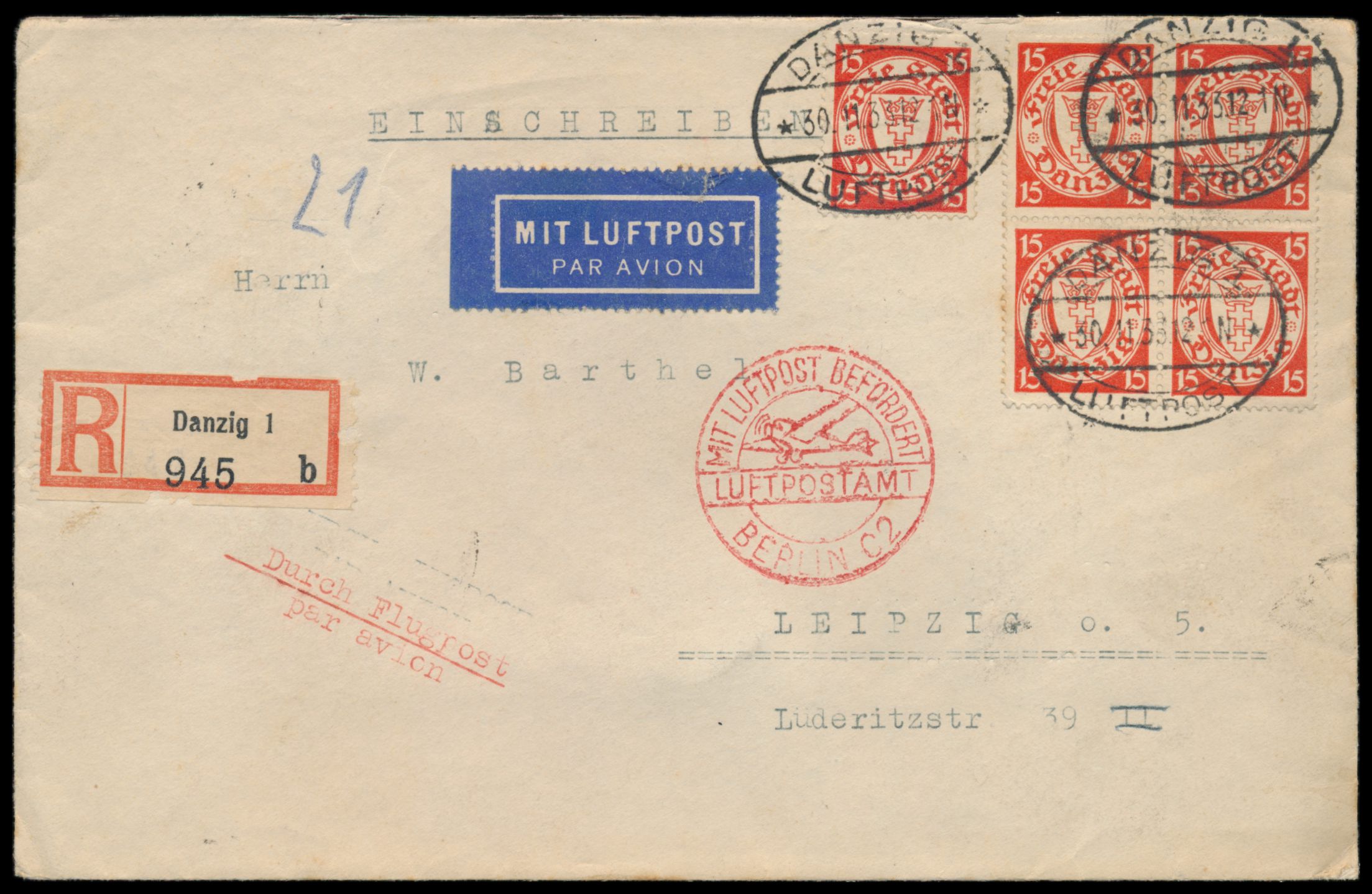 Viererblock und Einzelmarke 15 Pf. Staatswappen auf Luftpost-R-Brief mit Ovalstempel Danzig 1 Luftpost 30.11.33 nach Leipzig, Durchgangstempel Berlin C 2 30.11.33 und roter Stempel Mit Luftpost befördert Luftpostamt Berlin C 2, Ankunftstempel Leipzig 30.11. und 1.12.33