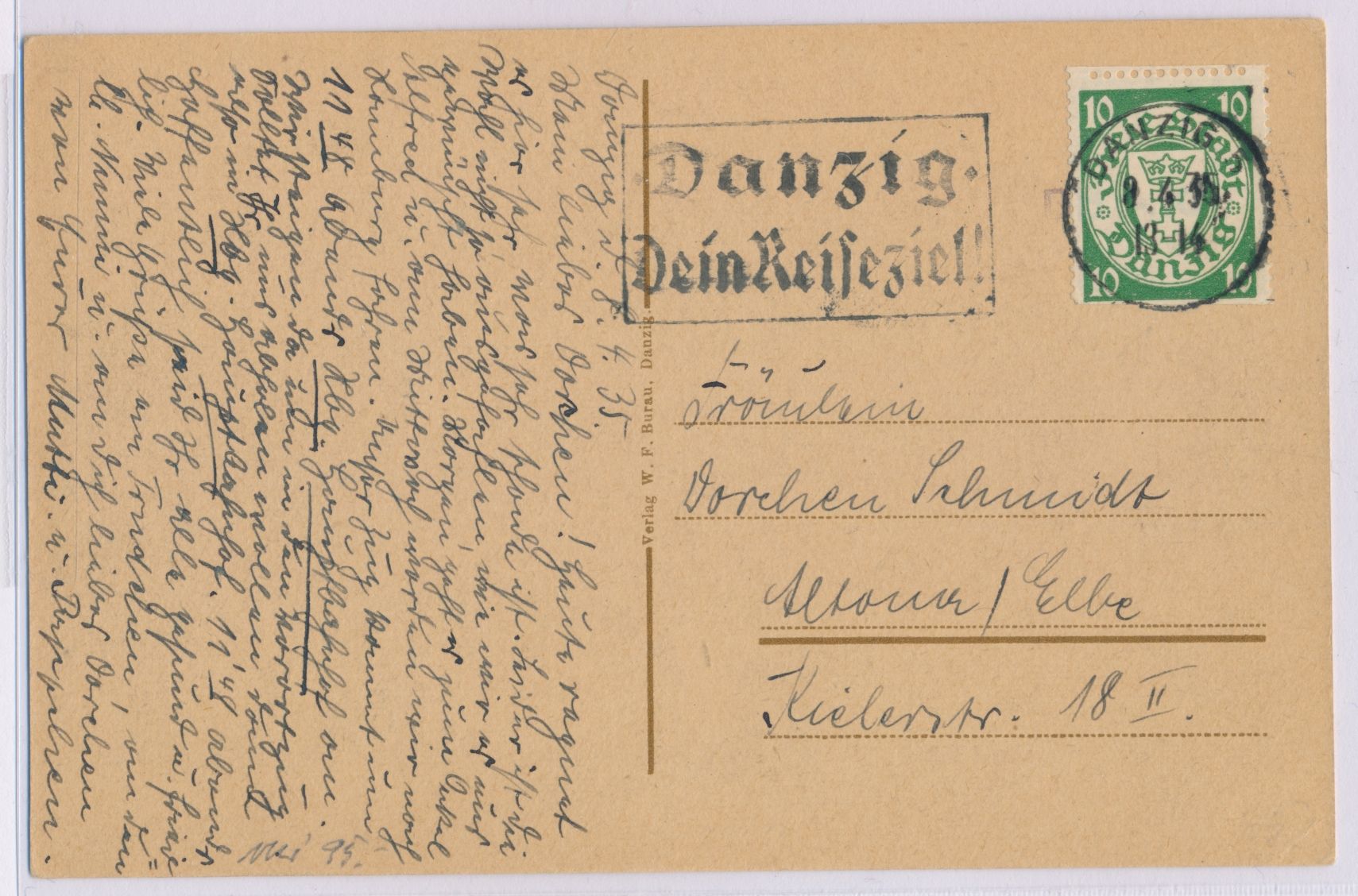 10 Pf. mit Rollenzähnung und Rollenschnitt auf Ansichtskarte Danzig - Fliegeraufnahme, Maschinenstempel Danzig 5 8.4.35, nach Hamburg-Altona, Bedarf