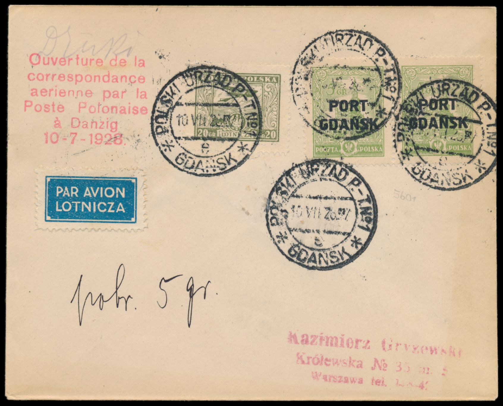 Polnische Post, Mischfrankatur 2 x 5 Gr. mit Polen-Flugpost 20 Gr. auf Luftpost-Drucksache nach Warschau, Stempel Gdansk e 10.7.28, Erstflug Danzig - Warschau, roter Bestätigungsstempel und Ankunftstempel Warszawa 10.7.28, nur 125 Sendungen befördert, Umschlag leicht gebräunt, Fischer-Nr. 61a