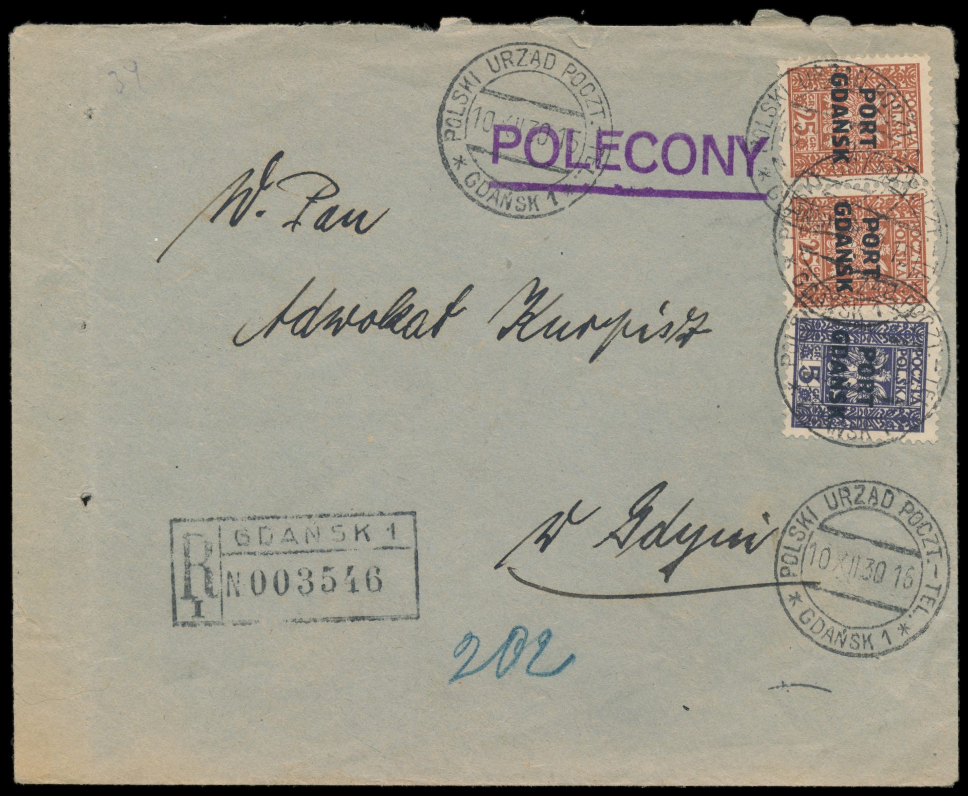 Polnische Post, Luftpost-Einschreibbrief nach Strzelno, Mischfrankatur Port Gdansk / Polen, Gesamtfrankatur 100 Gr., dabei 10 Gr. und 15 Gr. jeweils mit dünnem Aufdruck, Stempel Gdansk 1 5.9.28, Durchgangstempel Bydgoszcz 5.9.29, Ankunftstempel 6.9.29