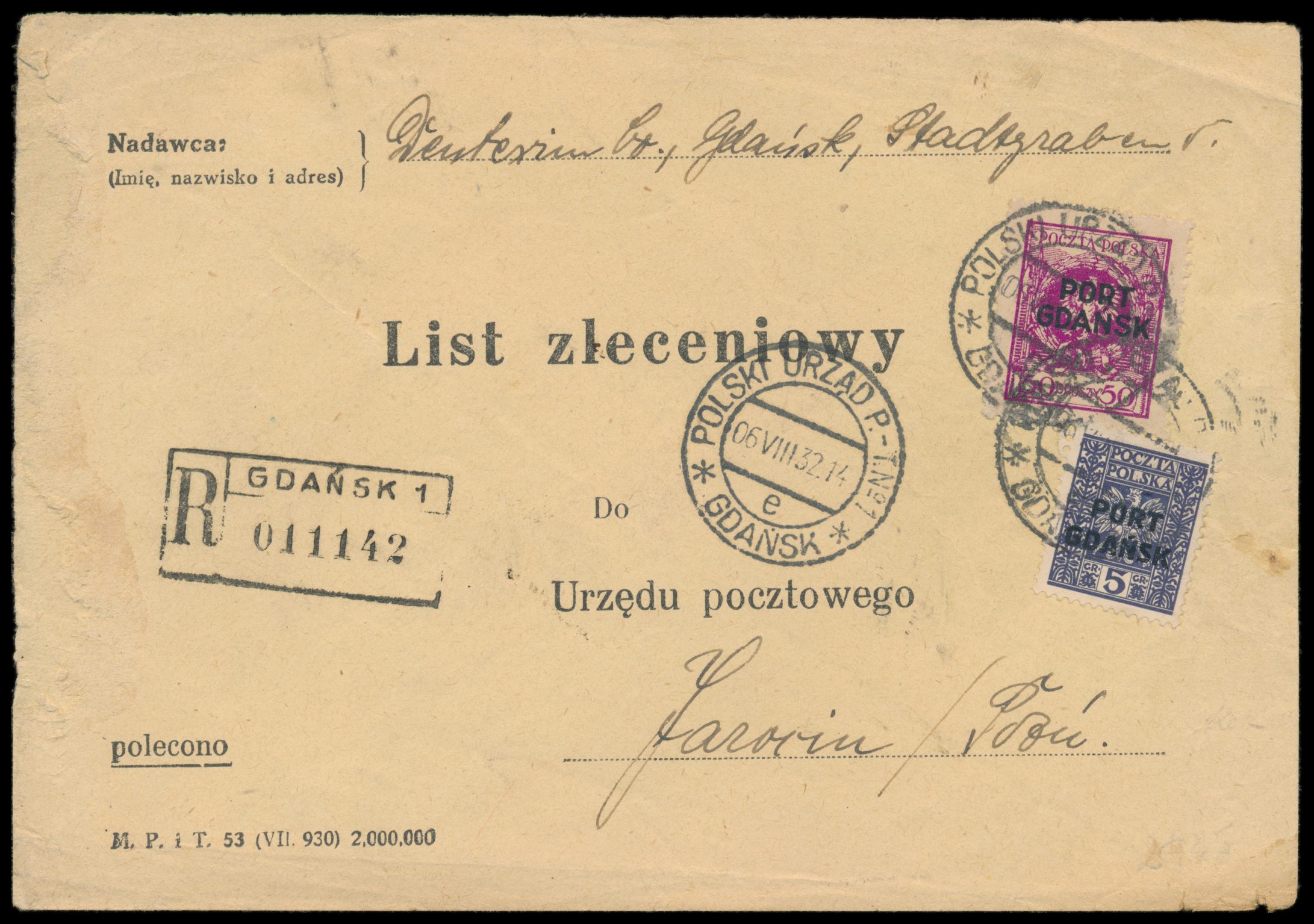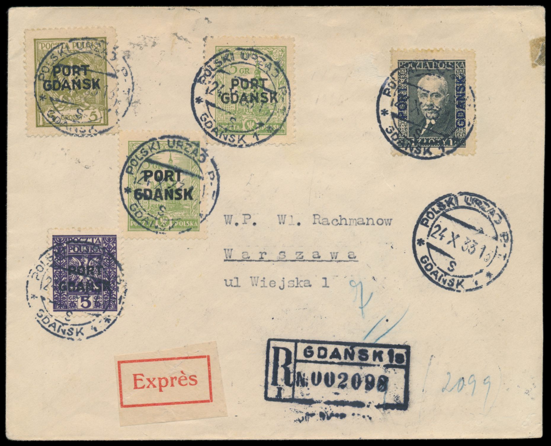 Polnische Post: Absenderfreistempel Gdansk FA-084 23.11.35 " The British and Polish Trade Bank A.G." , Wertangabe 055 Gr., Einschreibbrief nach Radom, schwarzer R-Stempel etwas undeutlich, Ankunftstempel 24.11.35, Umschlag hat zwei schwache waagerechte Büge, Bedarf