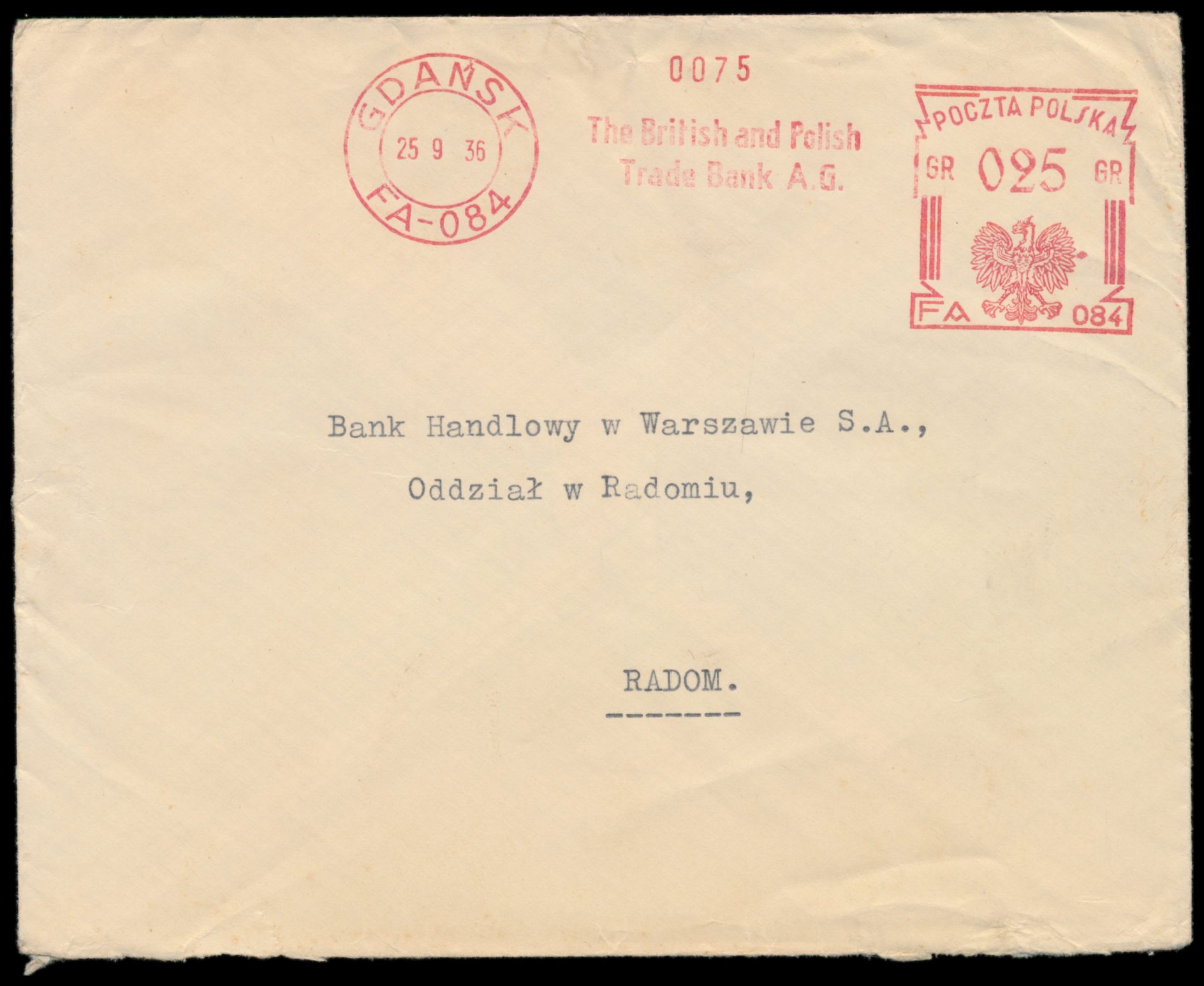 Polnische Post: Absenderfreistempel Gdansk FA-084 25.9.36 " The British and Polish Trade Bank A.G." , Wertangabe 025 Gr., Brief nach Radom, Bedarf