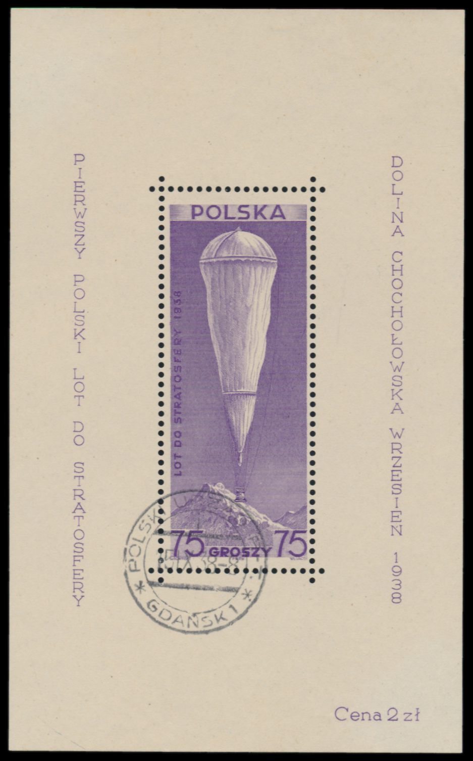 Polnische Post, Blockausgabe Geplanter 1. Polnischer Stratosphärenflug mit sauberem Stempel ... Gdansk 1 15.9.38, seltene Verwendung in Danzig